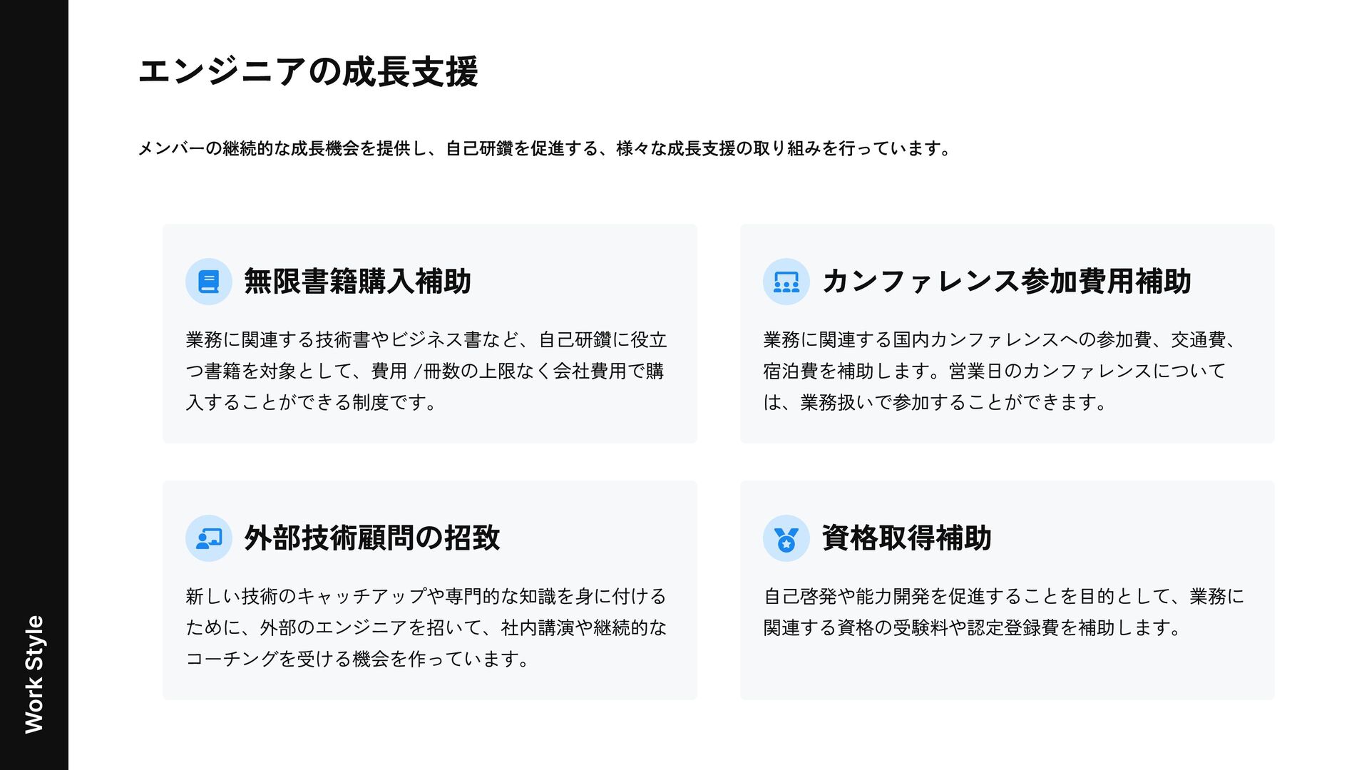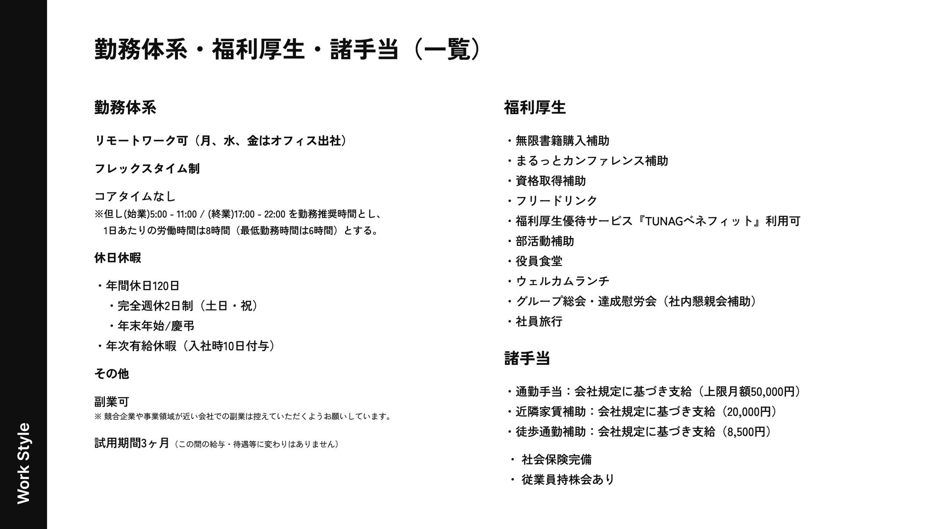 ※ 競合企業や事業領域が近い会社での副業は控えていただくようお願いしています。 試用期間3ヶ月(この間の給与・待遇等に変わりはありません) 福利厚生 ・無限書籍購入補助