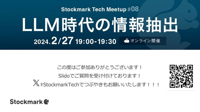 この度はご参加ありがとうございます︕ Slidoでご質問を受け付けております︕ #StockmarkTechでつぶやきもお願いいたします︕︕︕