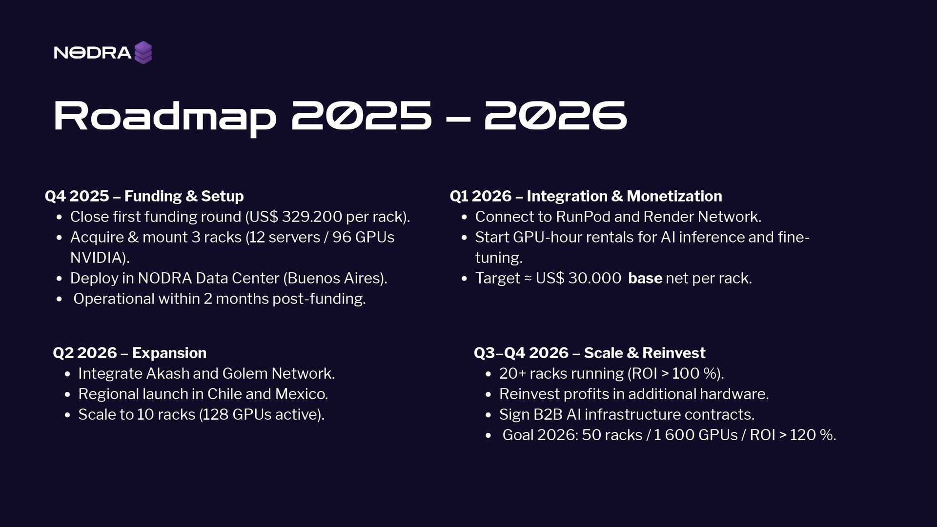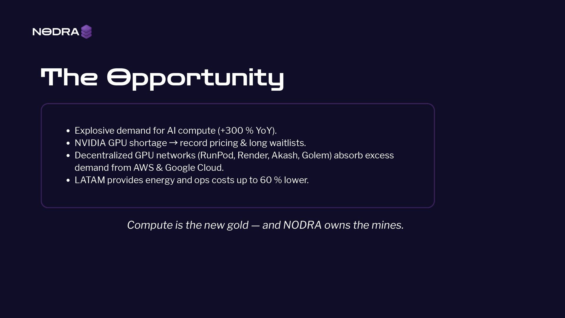 shortage → record pricing & long waitlists. Decentralized GPU networks (RunPod, Render, Akash, Golem) absorb excess demand from AWS & Google Cloud. LATAM provides energy and ops costs up to 60 % lower. The Opportunity Compute is the new gold — and NODRA owns the mines.