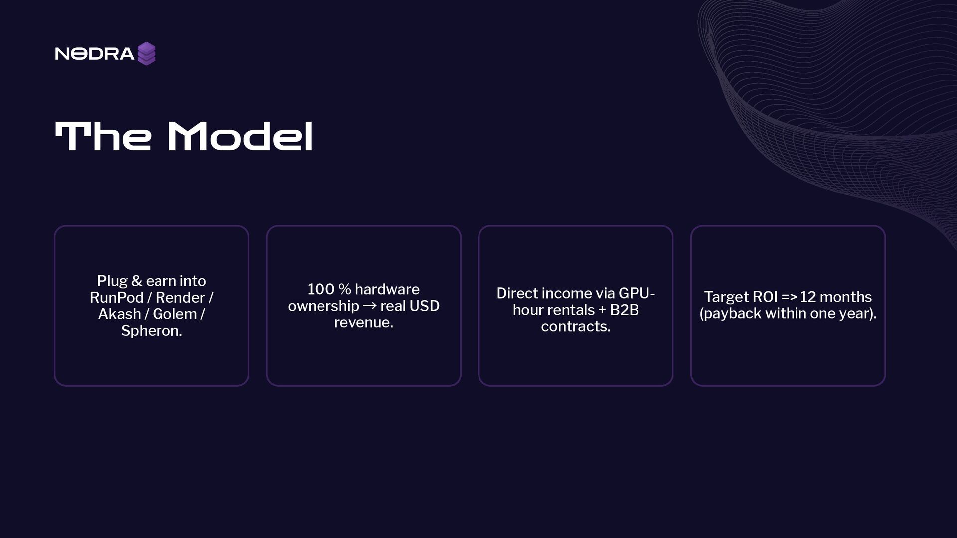 Akash / Golem / Spheron. 100 % hardware ownership → real USD revenue. Direct income via GPU- hour rentals + B2B contracts. Target ROI => 12 months (payback within one year).