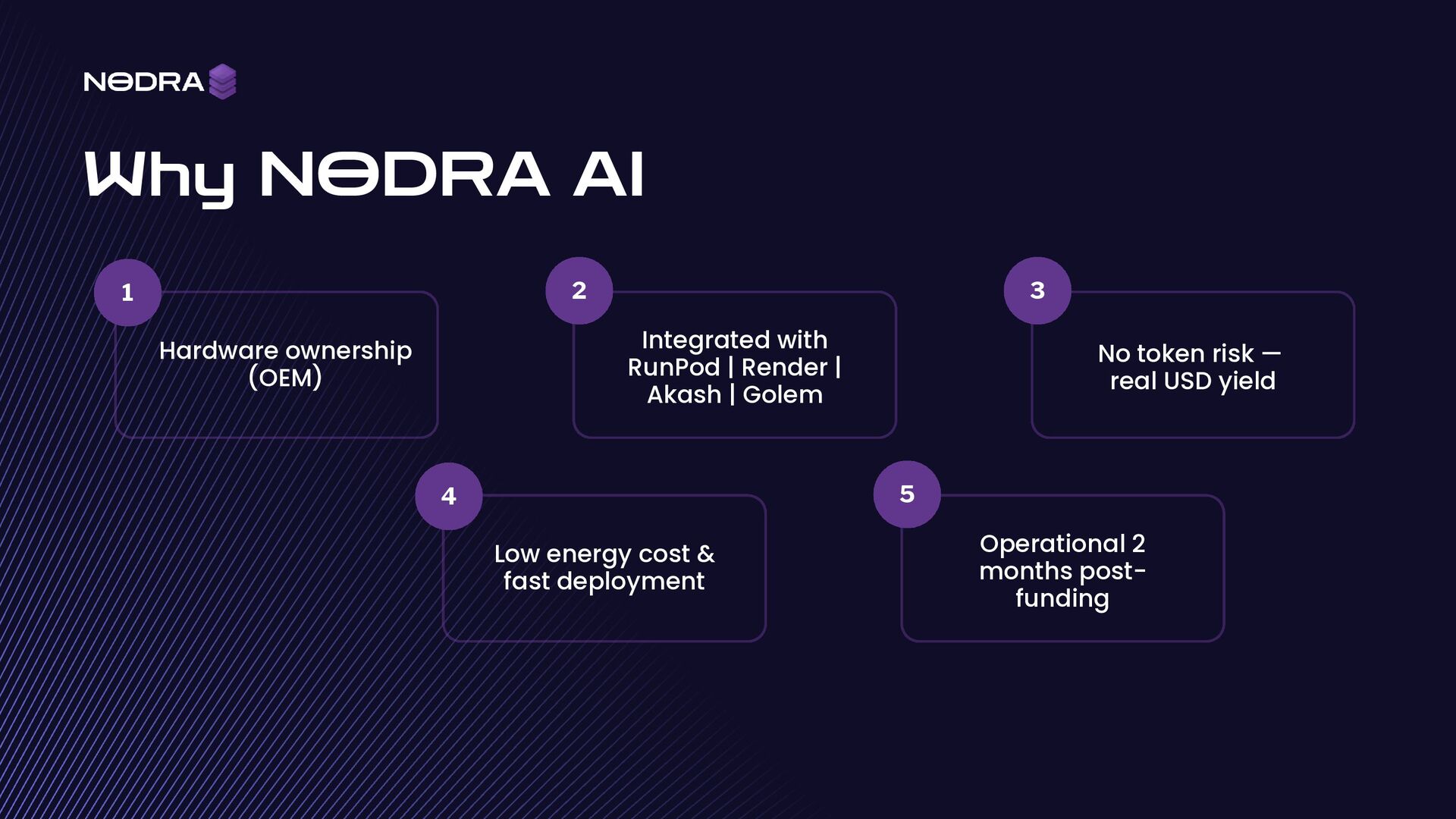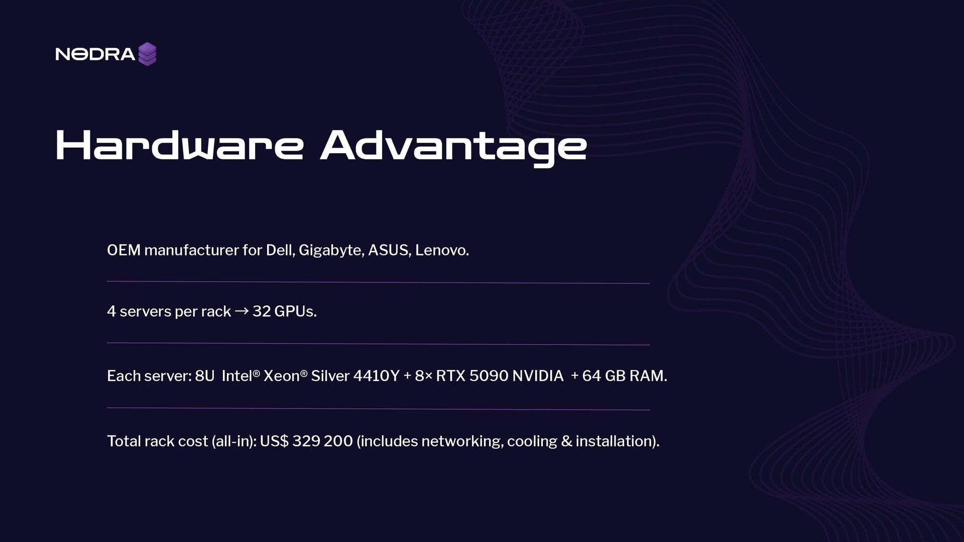 NODRA presents a scalable, enterprise-grade DePIN & AI infrastructure designed for real global workloads, combining proprietary hardware, a dedicated data center, and seamless integration with decentralized networks.