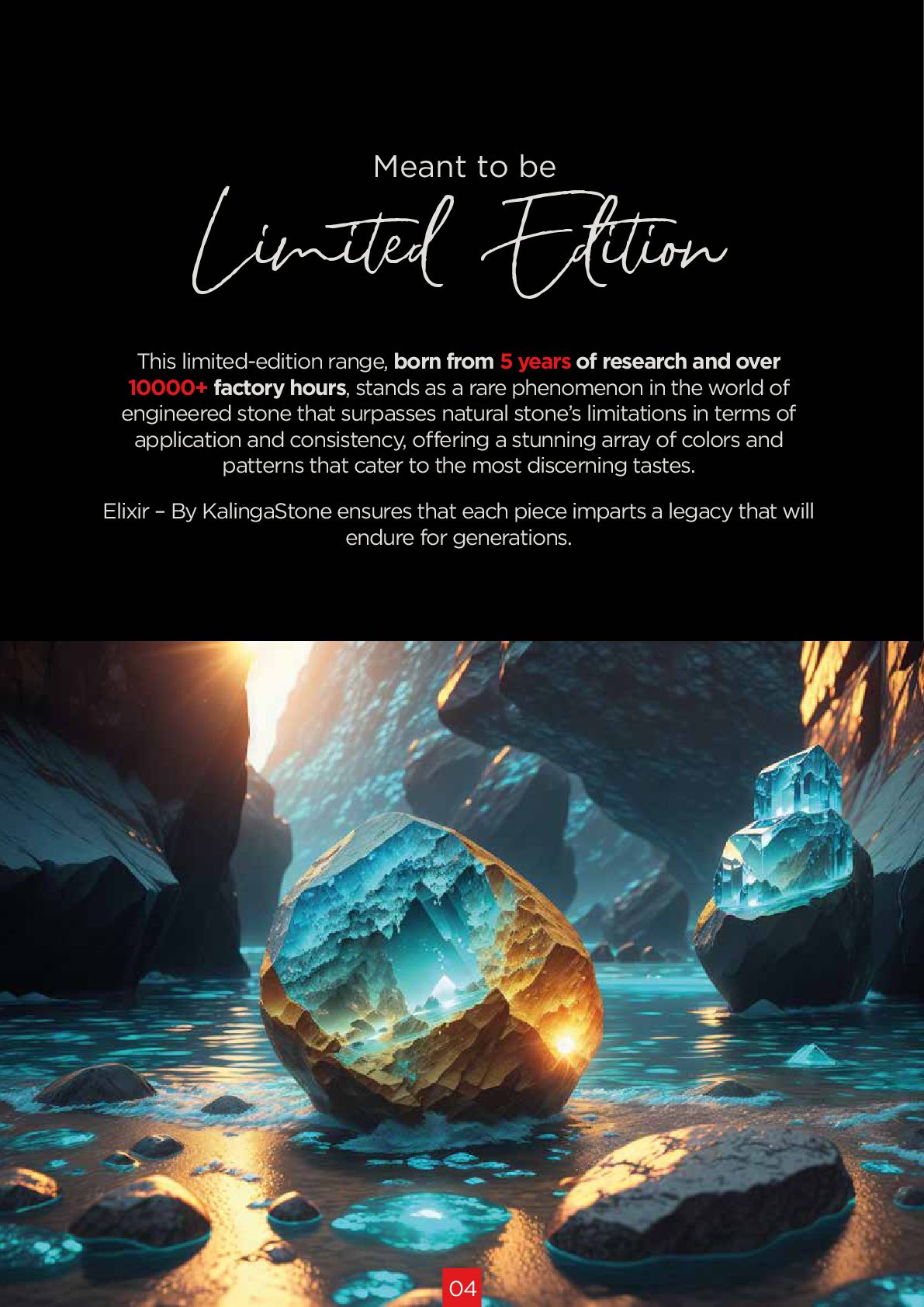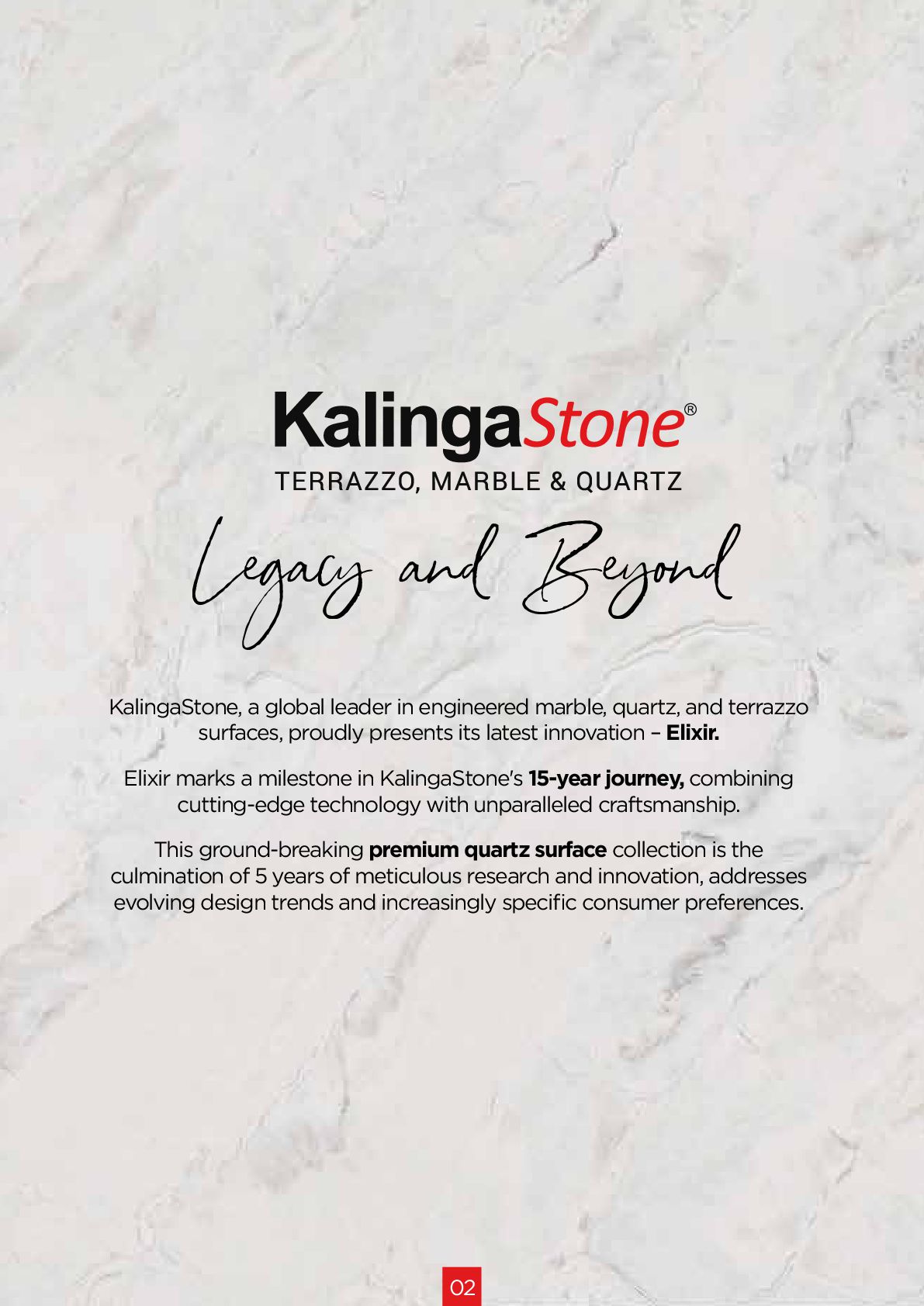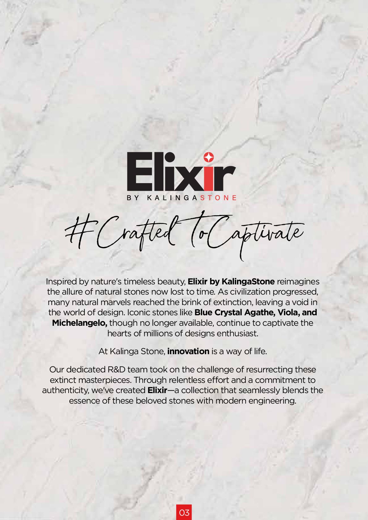 Elixir by KalingaStone is a premium, limited edition quartz surface collection inspired by rare natural stones and crafted through advanced engineering. Developed over five years of research, Elixir blends artistic expression with superior durability, offering distinctive surfaces for luxury interiors, countertops, flooring, wall cladding, and statement spaces.