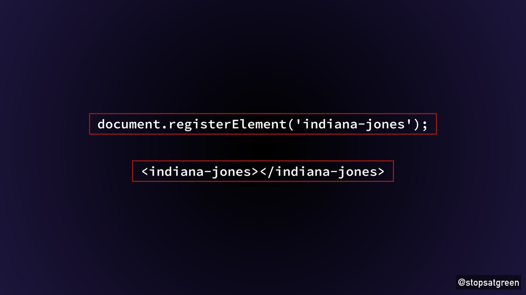 @stopsatgreen <indiana-jones></indiana-jones> document.registerElement('indiana-jones');