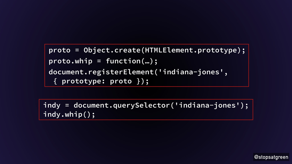 @stopsatgreen proto = Object.create(HTMLElement.prototype); proto.whip = function(…); document.registerElement('indiana-jones', { prototype: