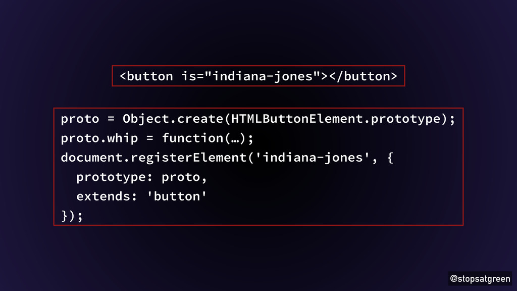 @stopsatgreen <button is="indiana-jones"></button> proto = Object.create(HTMLButtonElement.prototype); proto.whip = function(…); document.registerElement('indiana-jones',