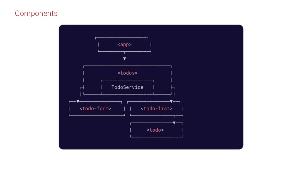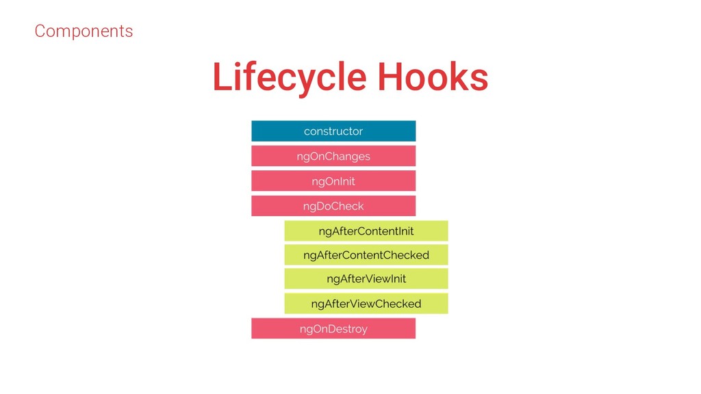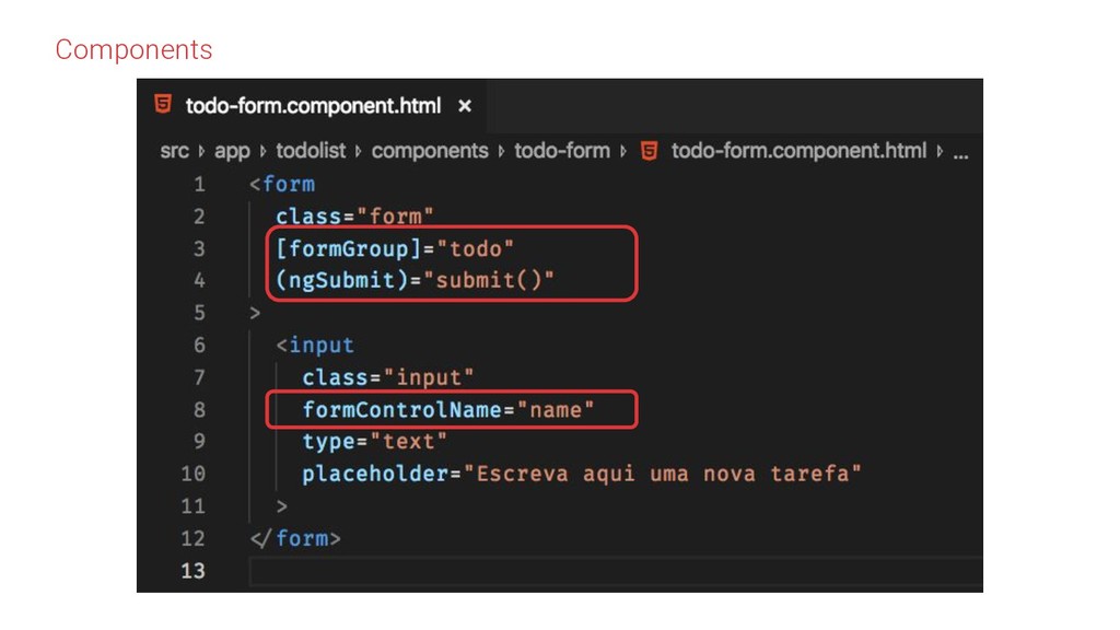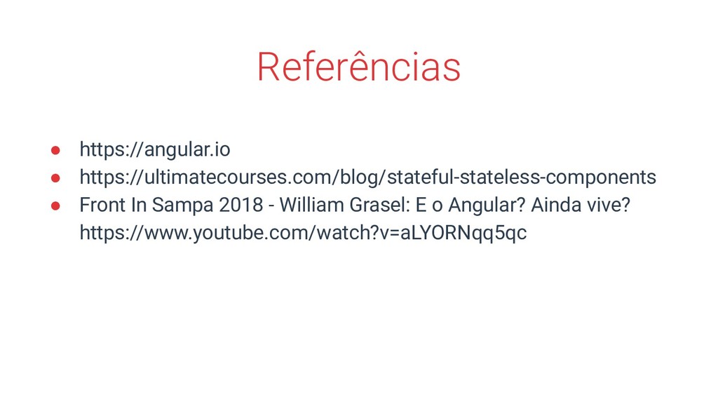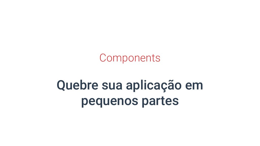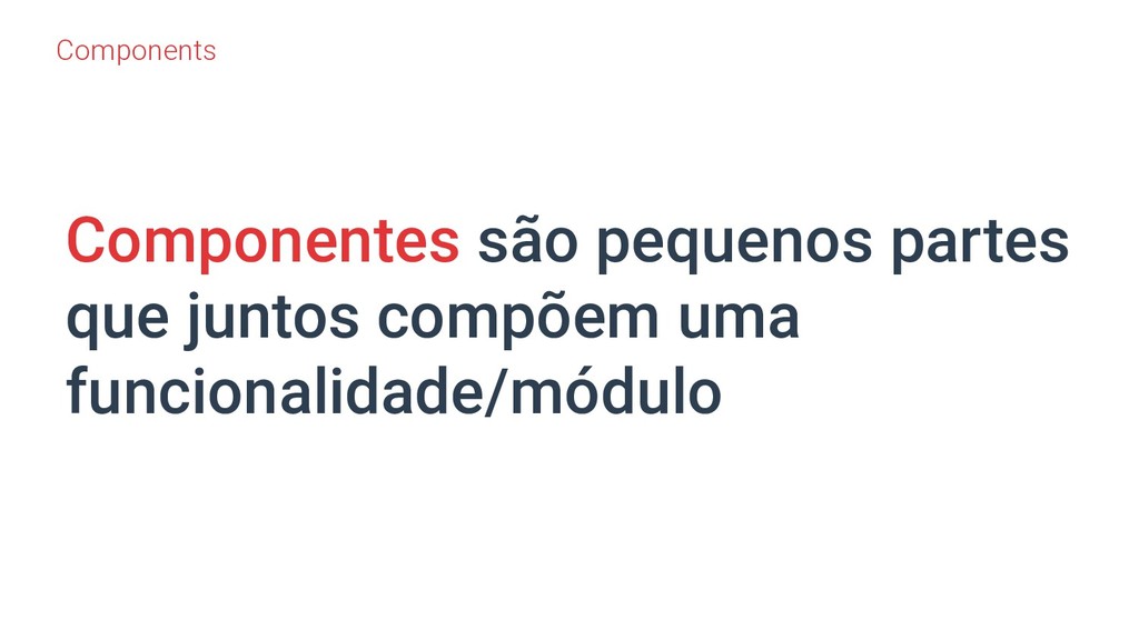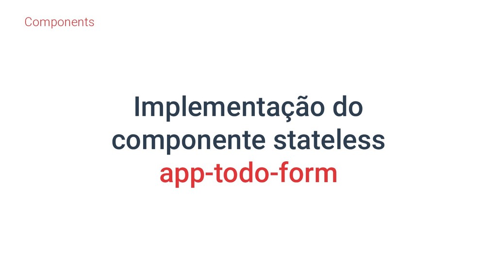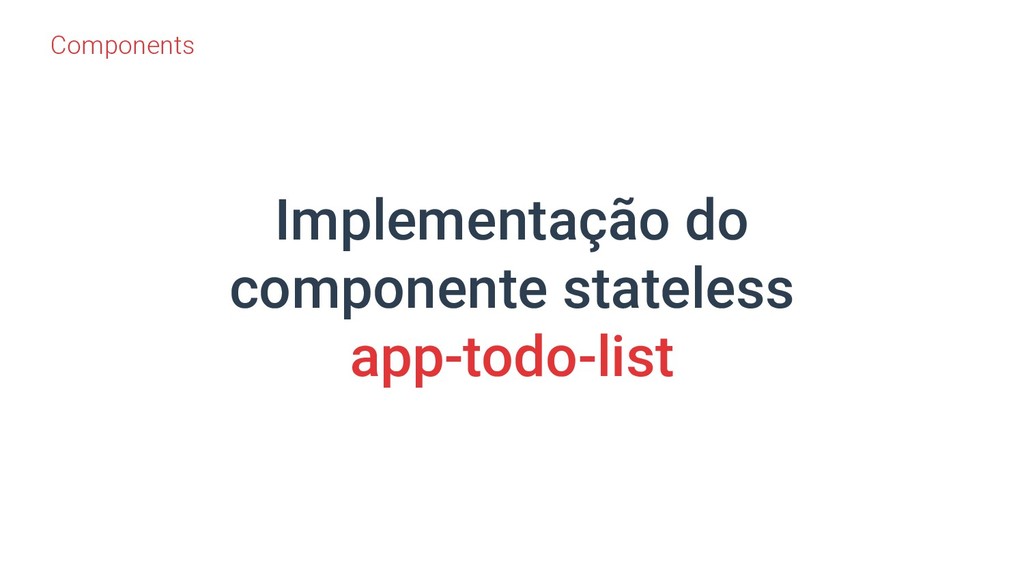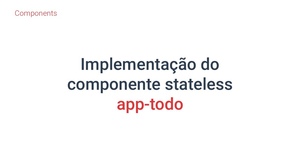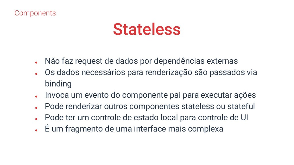 • Os dados necessários para renderização são passados via binding • Invoca um evento do componente pai para executar ações • Pode renderizar outros componentes stateless ou stateful • Pode ter um controle de estado local para controle de UI • É um fragmento de uma interface mais complexa Components