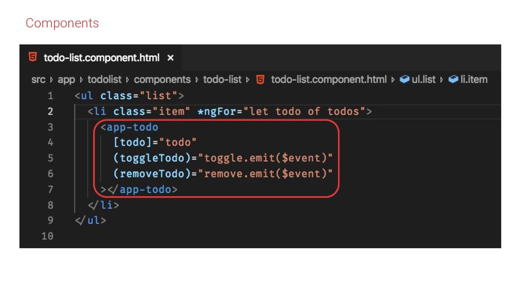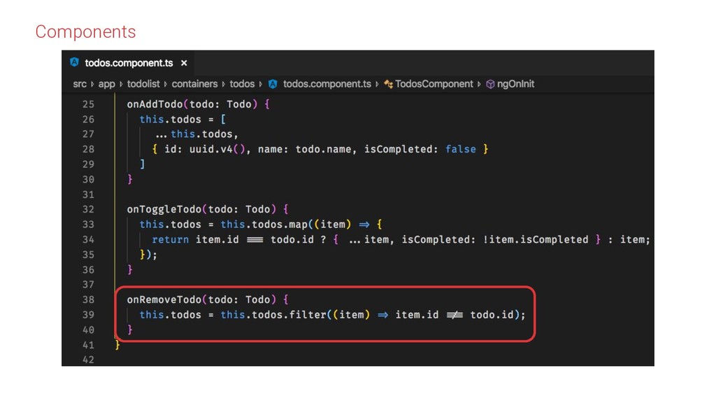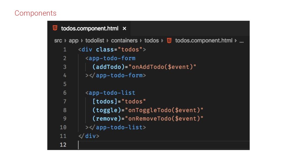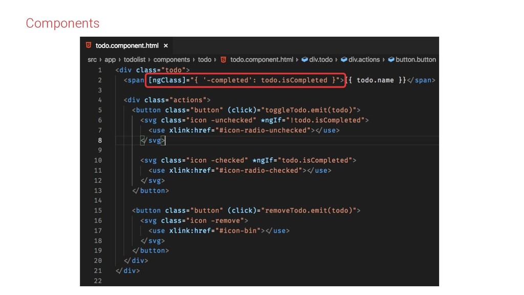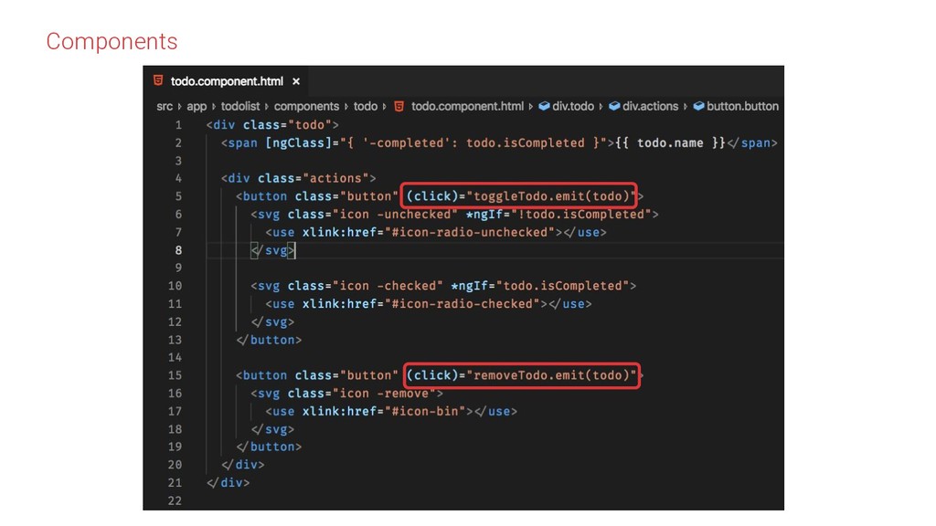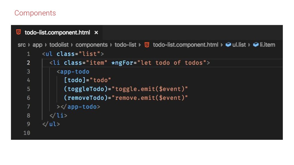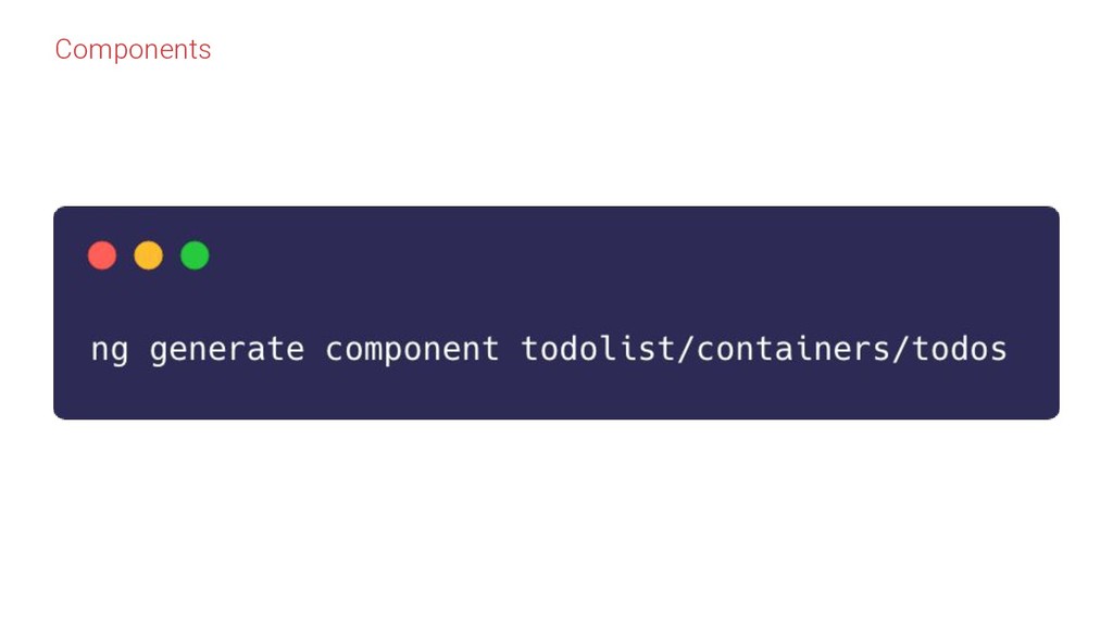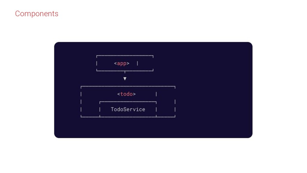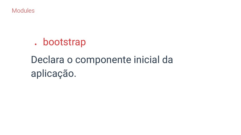 • Os dados necessários para renderização são passados via binding • Invoca um evento do componente pai para executar ações • Pode renderizar outros componentes stateless ou stateful • Pode ter um controle de estado local para controle de UI • É um fragmento de uma interface mais complexa Components