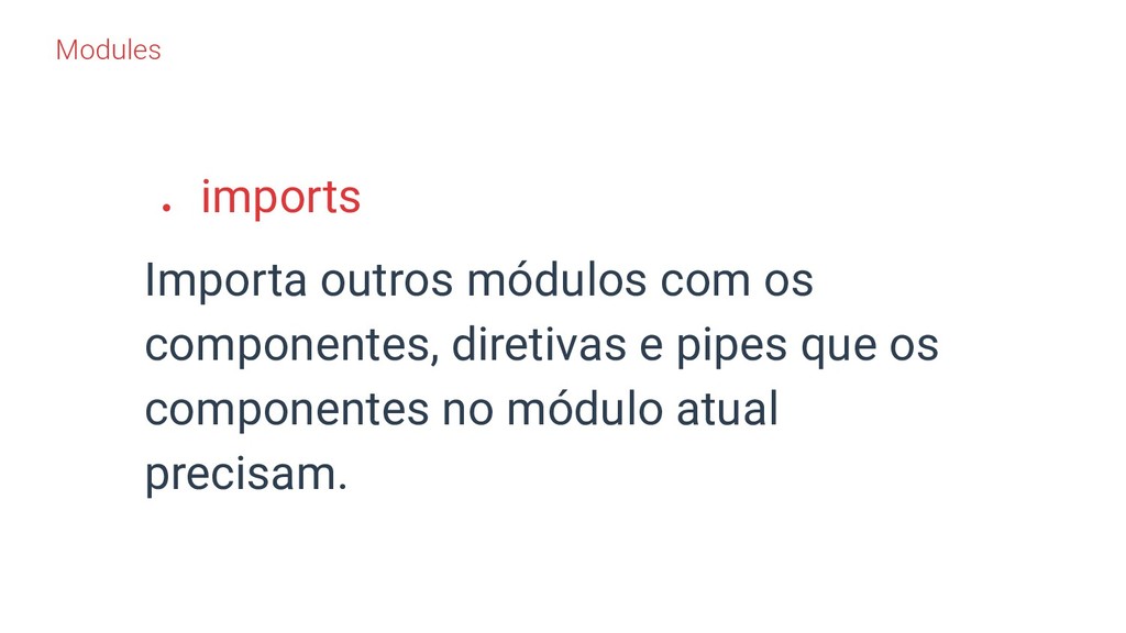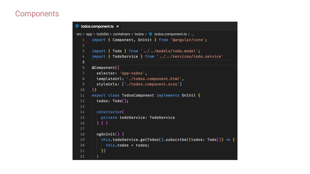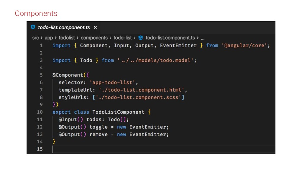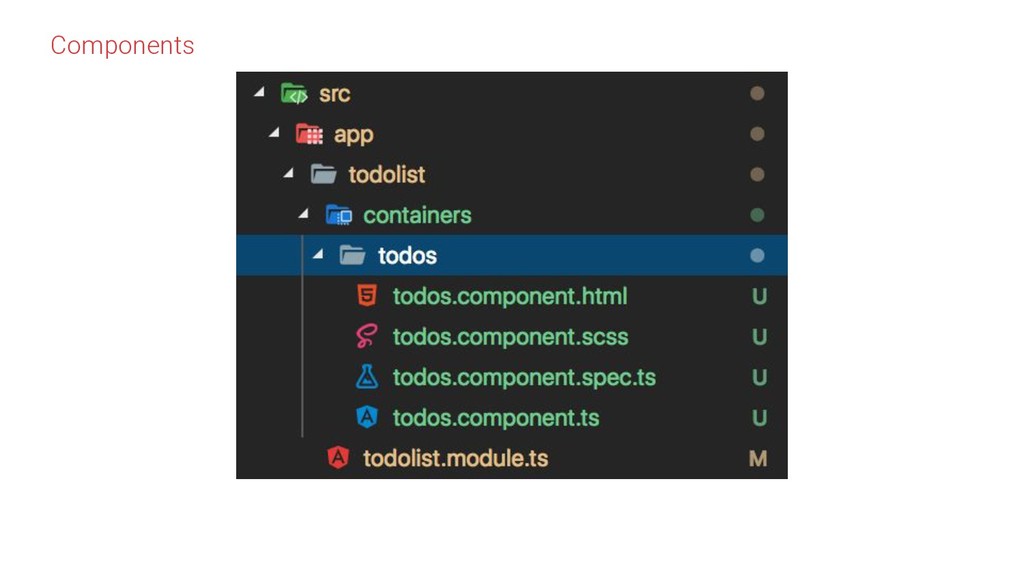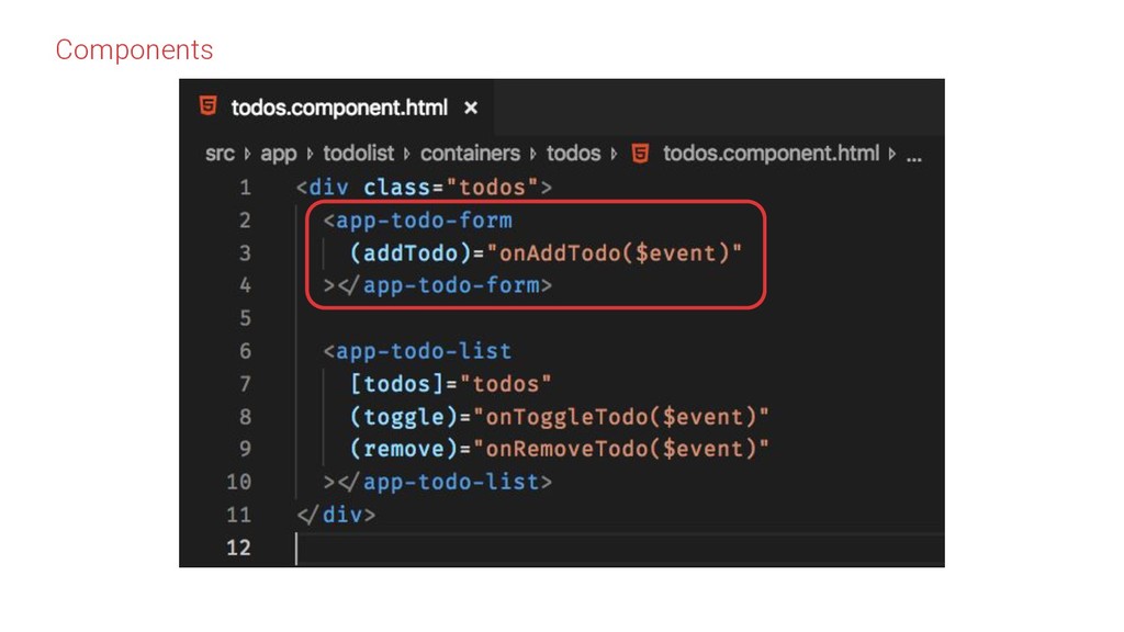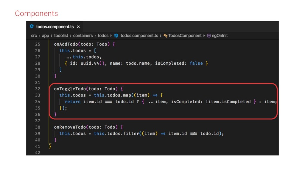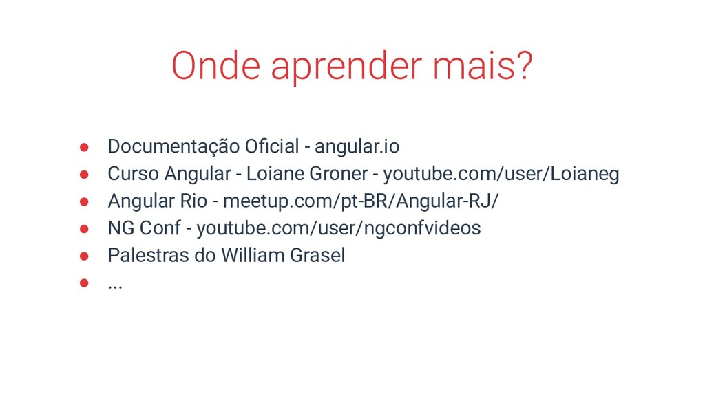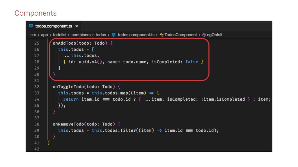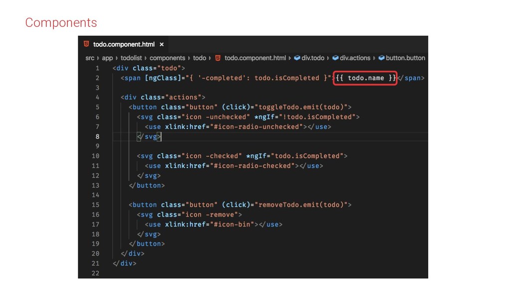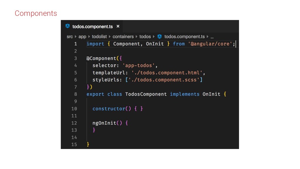 • Os dados necessários para renderização são passados via binding • Invoca um evento do componente pai para executar ações • Pode renderizar outros componentes stateless ou stateful • Pode ter um controle de estado local para controle de UI • É um fragmento de uma interface mais complexa Components