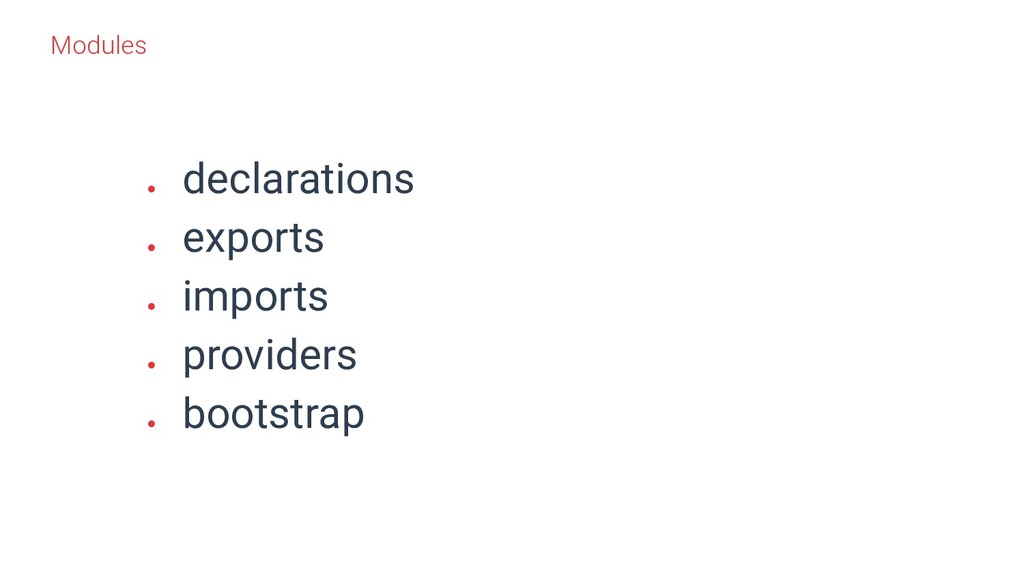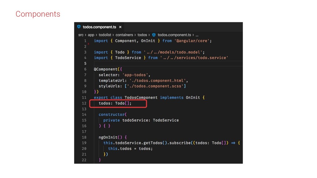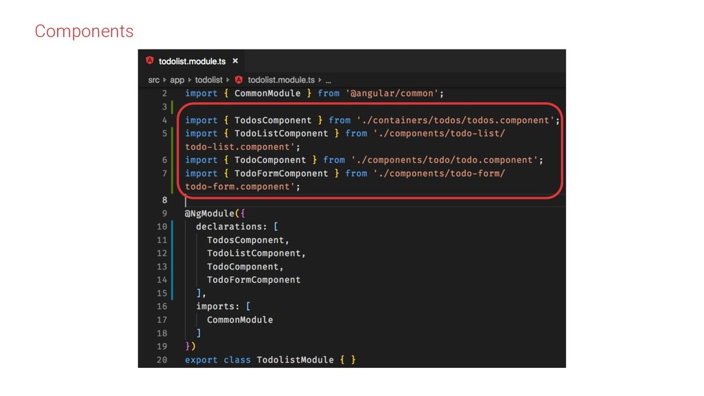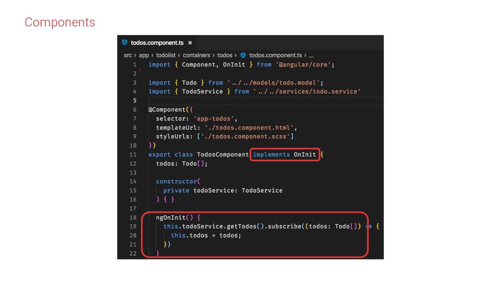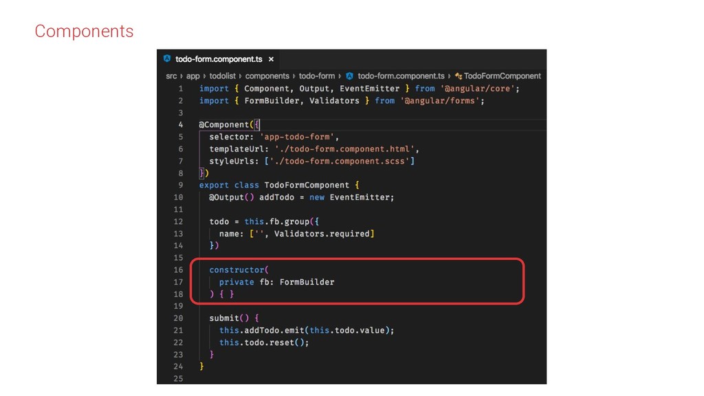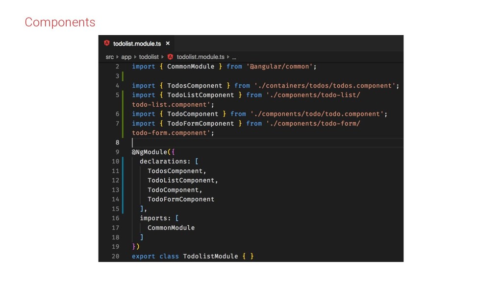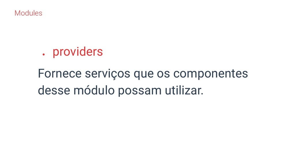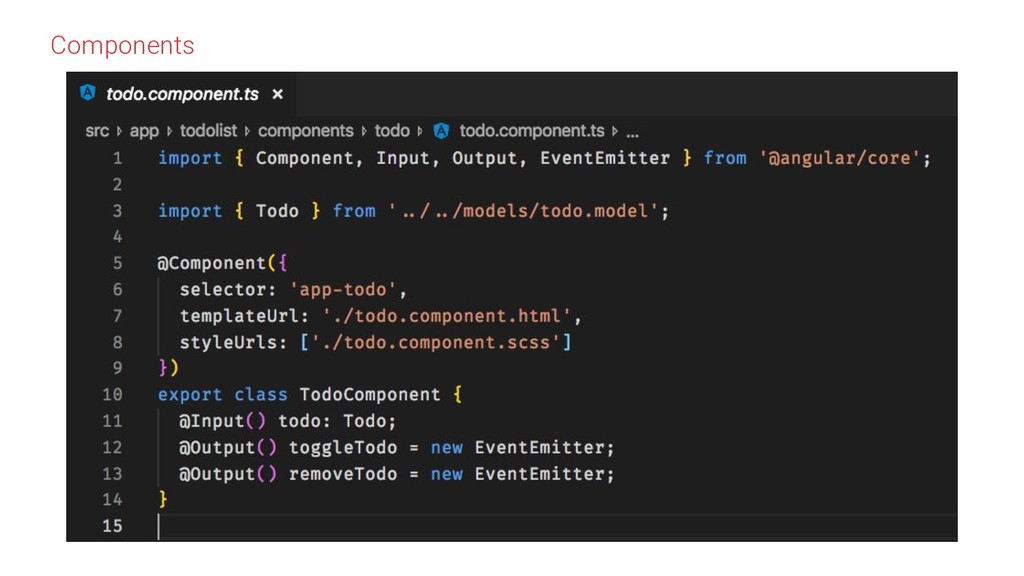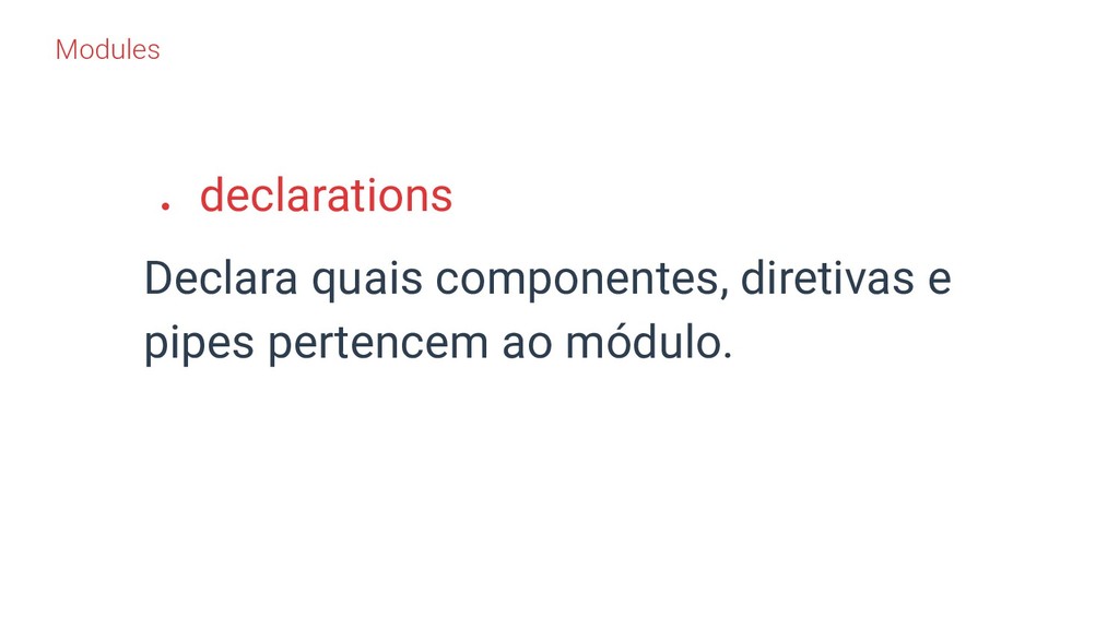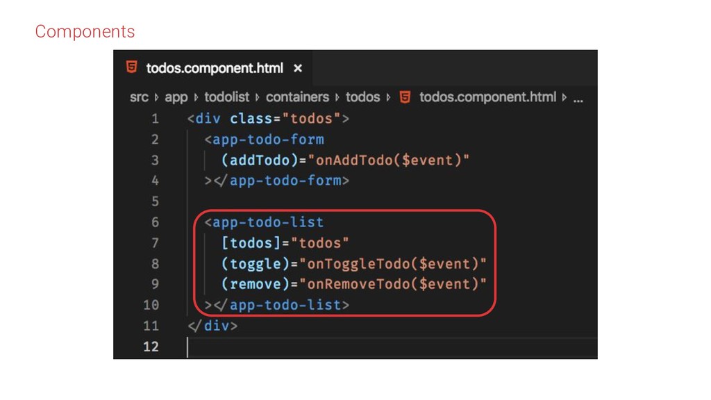 • Os dados necessários para renderização são passados via binding • Invoca um evento do componente pai para executar ações • Pode renderizar outros componentes stateless ou stateful • Pode ter um controle de estado local para controle de UI • É um fragmento de uma interface mais complexa Components