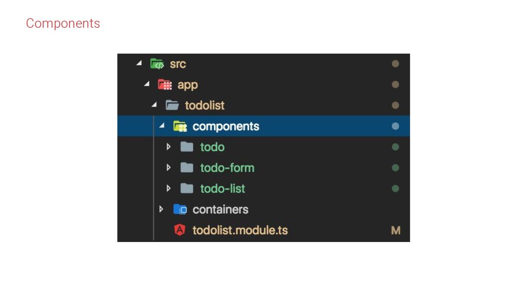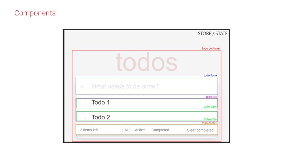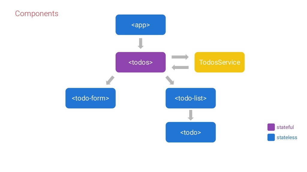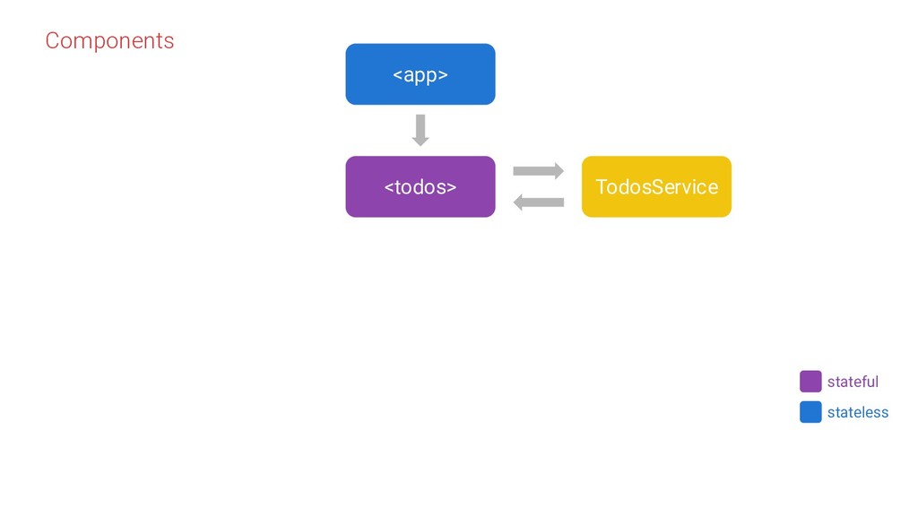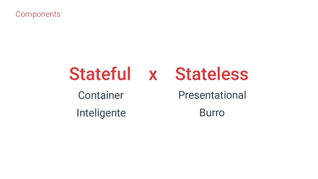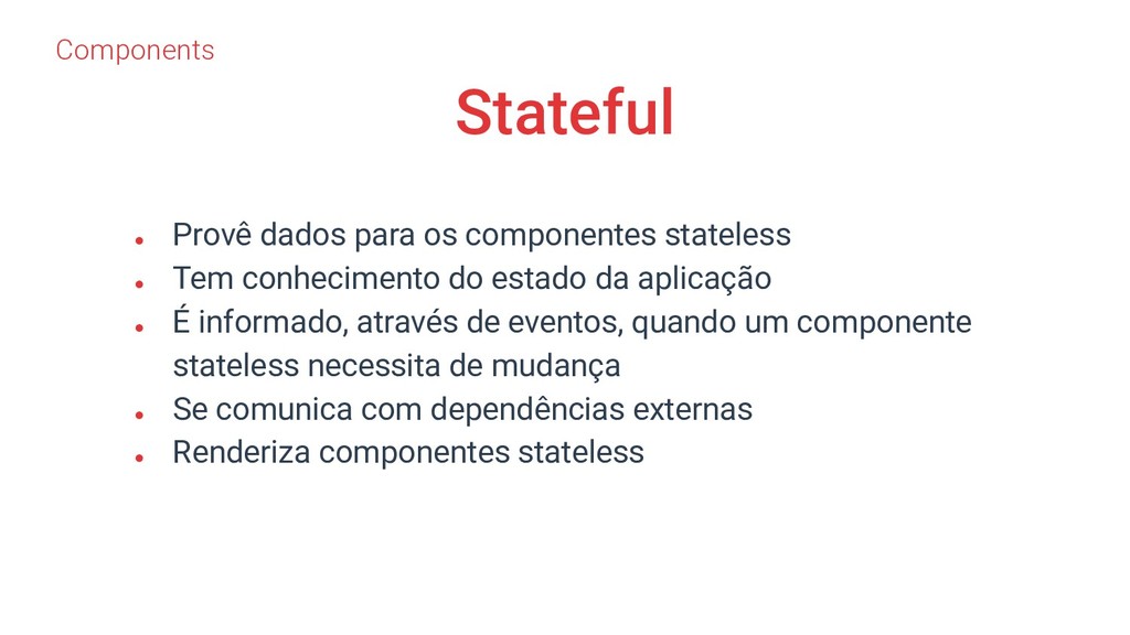 conhecimento do estado da aplicação • É informado, através de eventos, quando um componente stateless necessita de mudança • Se comunica com dependências externas • Renderiza componentes stateless Components