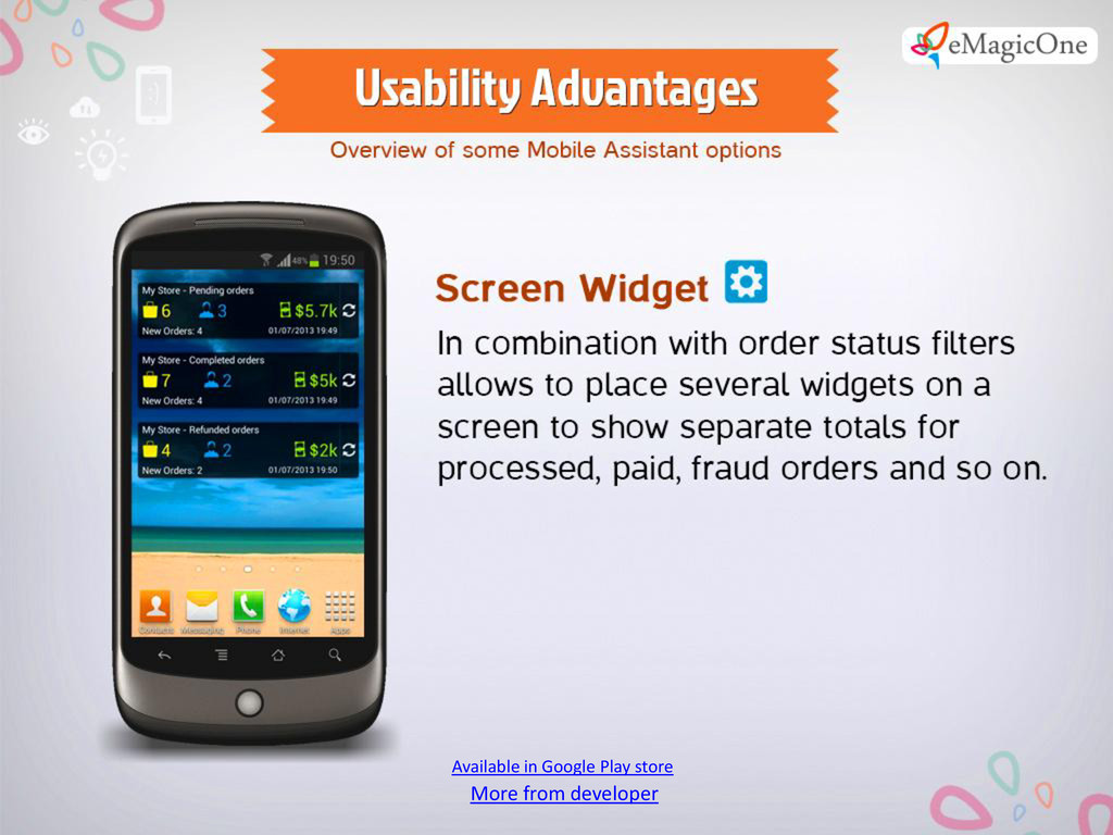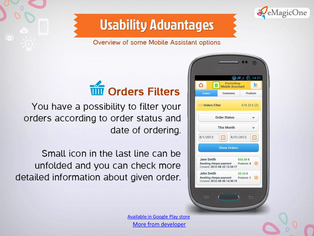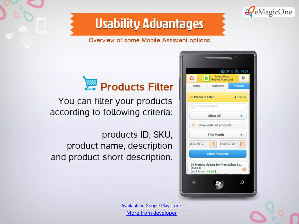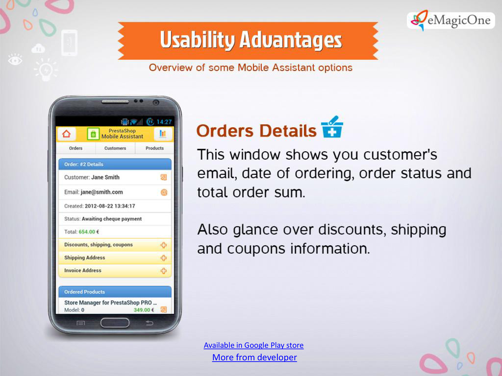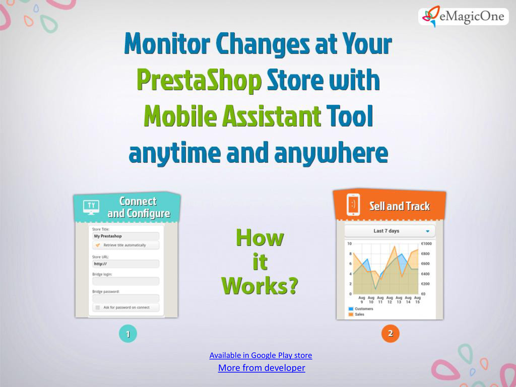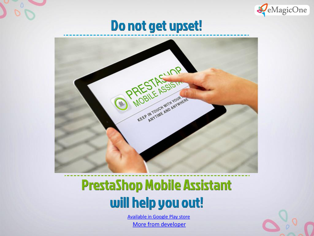 Can’t make up your mind and leave your PrestaShop store for several days? Give up the idea to take a rest for several days, because you have nobody to shift responsibility to? Stop that! Turn to PrestaShop Mobile Assistant from this point onwards. You will have your store on your mobile device everywhere. Minimum efforts - maximum results. Control your PrestaShop store with must-have Mobile Assistant.