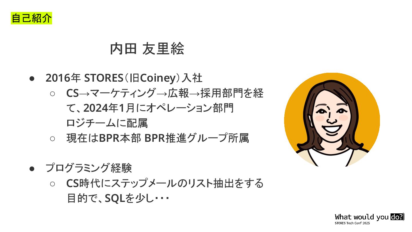 内田 友里絵 • 2016年 STORES(旧Coiney)入社 ◦ CS→マーケティング→広報→採用部門を経 て、2024年1月にオペレーション部門 ロジチームに配属 ◦