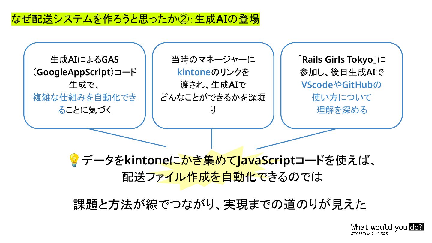 💡データをkintoneにかき集めてJavaScriptコードを使えば、 配送ファイル作成を自動化できるのでは 課題と方法が線でつながり、実現までの道のりが見えた 生成AIによるGAS (GoogleAppScript)コード 生成で、 複雑な仕組みを自動化でき ることに気づく 当時のマネージャーに kintoneのリンクを