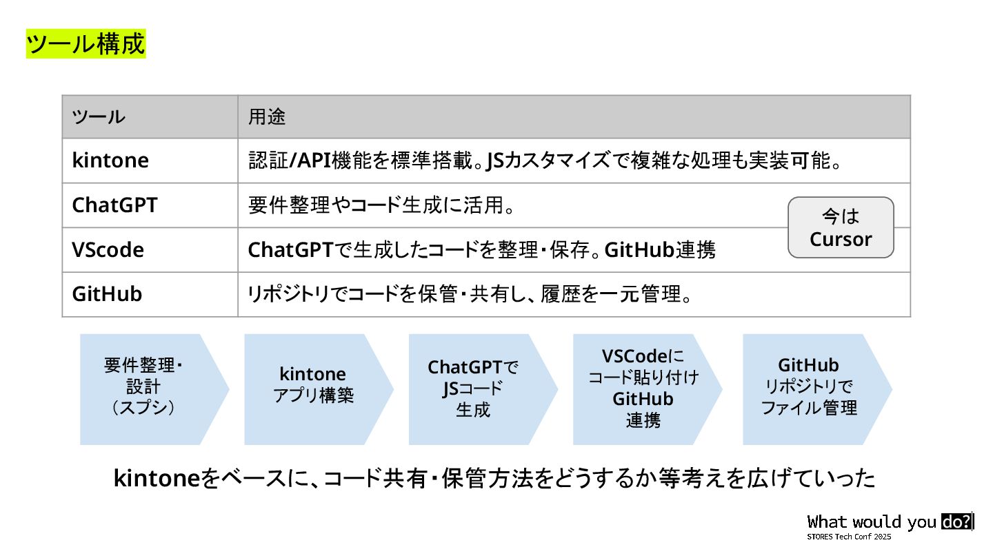 要件整理・ 設計 (スプシ) kintone アプリ構築 ChatGPTで JSコード 生成 VSCodeに コード貼り付け GitHub 連携 GitHub リポジトリで ファイル管理 kintoneをベースに、コード共有・保管方法をどうするか等考えを広げていった 今は Cursor ツール構成