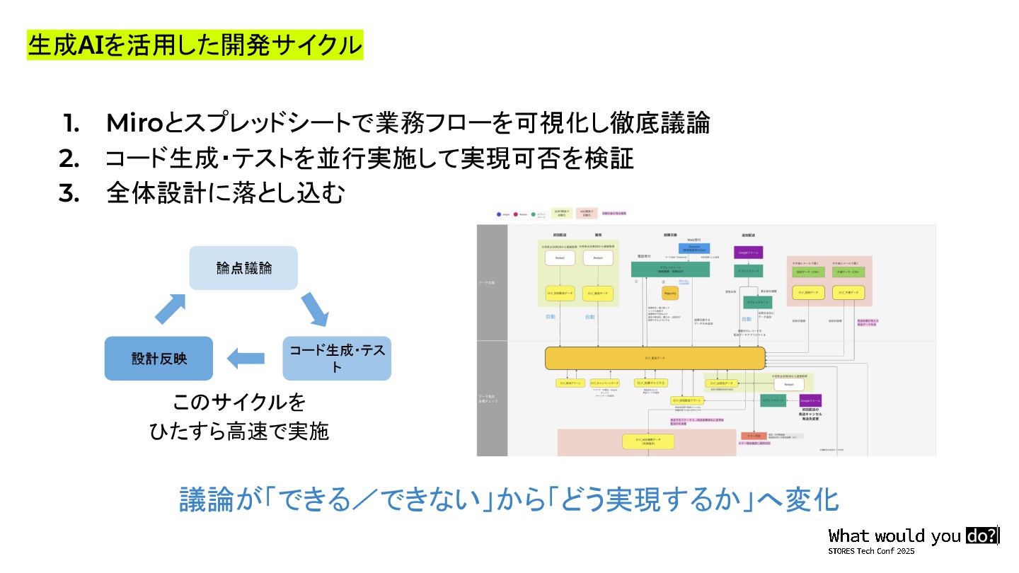 コード生成・テス ト 設計反映 論点議論 1. Miroとスプレッドシートで業務フローを可視化し徹底議論 2. コード生成・テストを並行実施して実現可否を検証 3. 全体設計に落とし込む