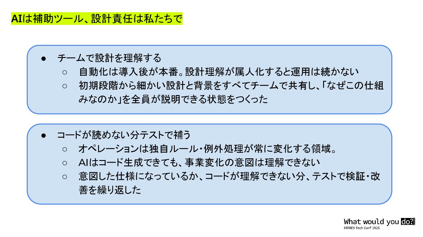 オペレーションは独自ルール・例外処理が常に変化する領域。 ◦ AIはコード生成できても、事業変化の意図は理解できない ◦ 意図した仕様になっているか、コードが理解できない分、テストで検証・改 善を繰り返した AIは補助ツール、設計責任は私たちで