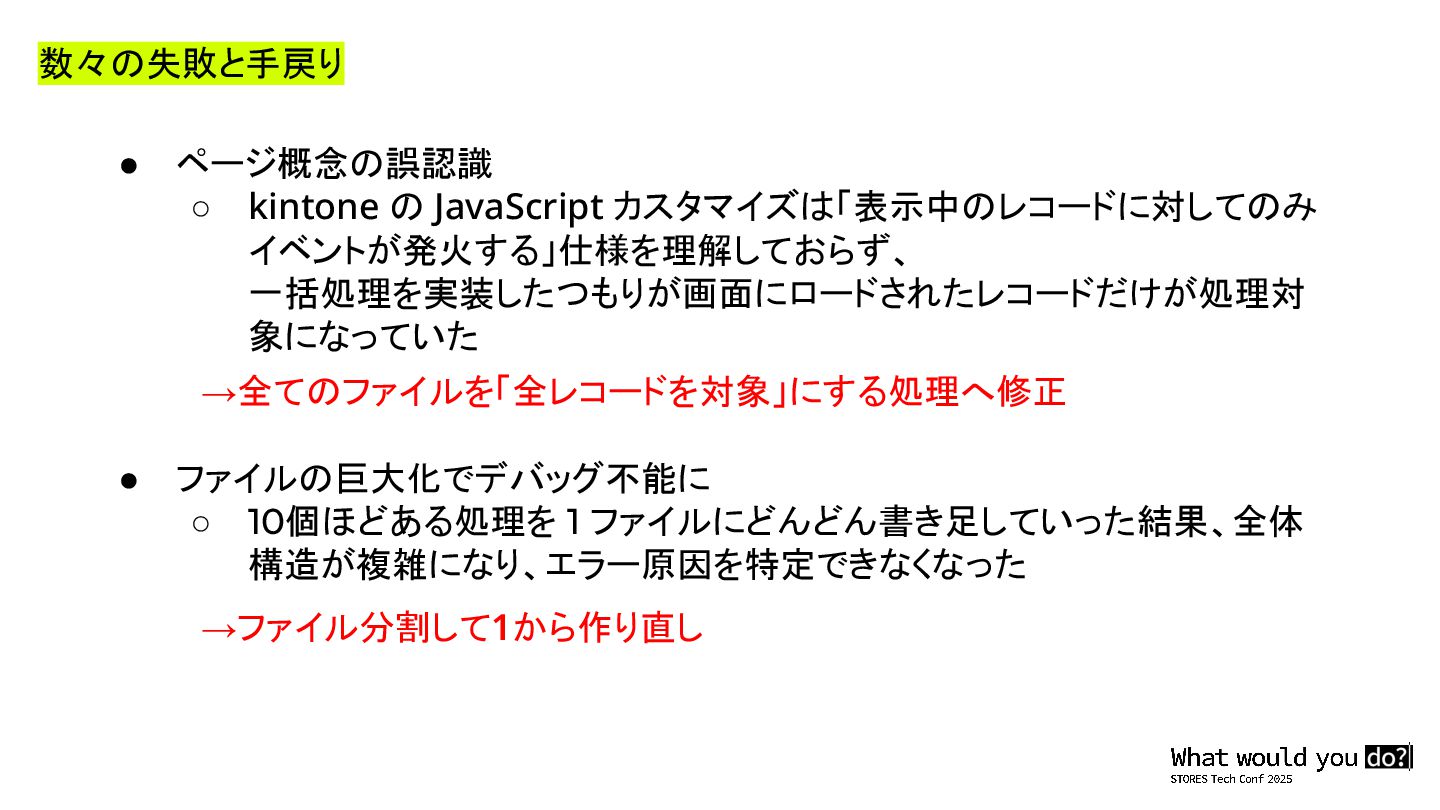 →全てのファイルを「全レコードを対象」にする処理へ修正 →ファイル分割して1から作り直し • ページ概念の誤認識 ◦ kintone の JavaScript カスタマイズは「表示中のレコードに対してのみ イベントが発火する」仕様を理解しておらず、