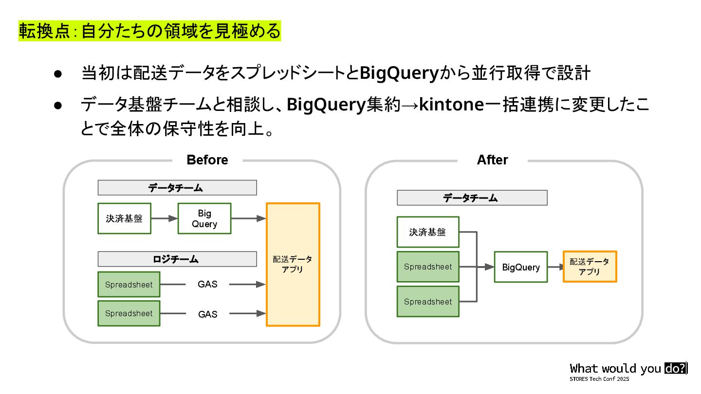アプリ Before データチーム After Spreadsheet 決済基盤 データチーム ロジチーム GAS GAS 転換点:自分たちの領域を見極める • 当初は配送データをスプレッドシートとBigQueryから並行取得で設計 • データ基盤チームと相談し、BigQuery集約→kintone一括連携に変更したこ とで全体の保守性を向上。