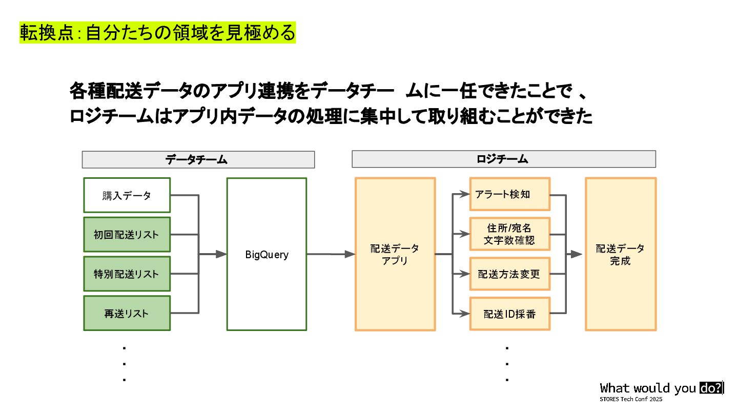 住所/宛名 文字数確認 配送方法変更 配送ID採番 配送データ 完成 ・ ・ ・ ・ ・ ・ 各種配送データのアプリ連携をデータチー ムに一任できたことで 、 ロジチームはアプリ内データの処理に集中して取り組むことができた 転換点:自分たちの領域を見極める