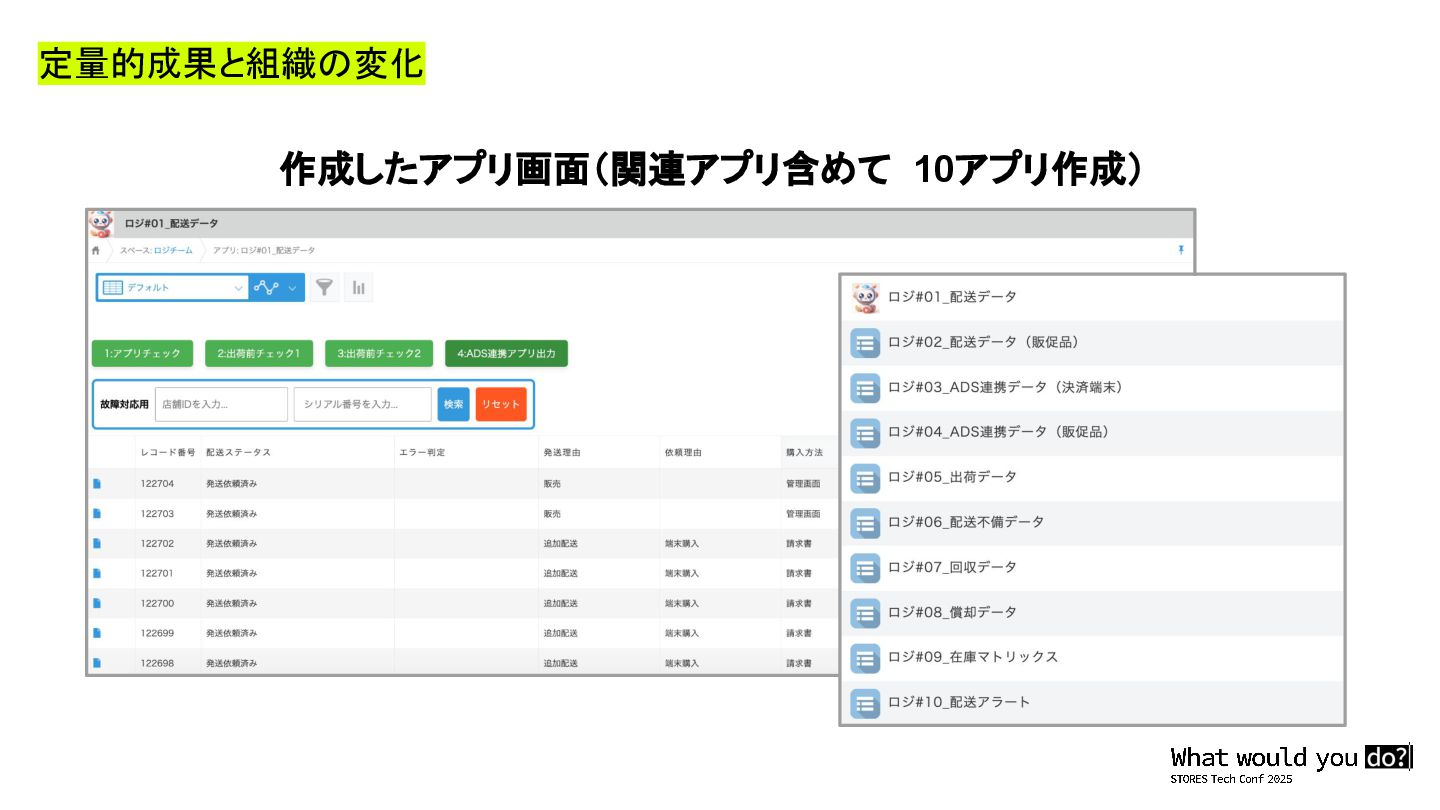 作成したアプリ画面(関連アプリ含めて 10アプリ作成) 定量的成果と組織の変化