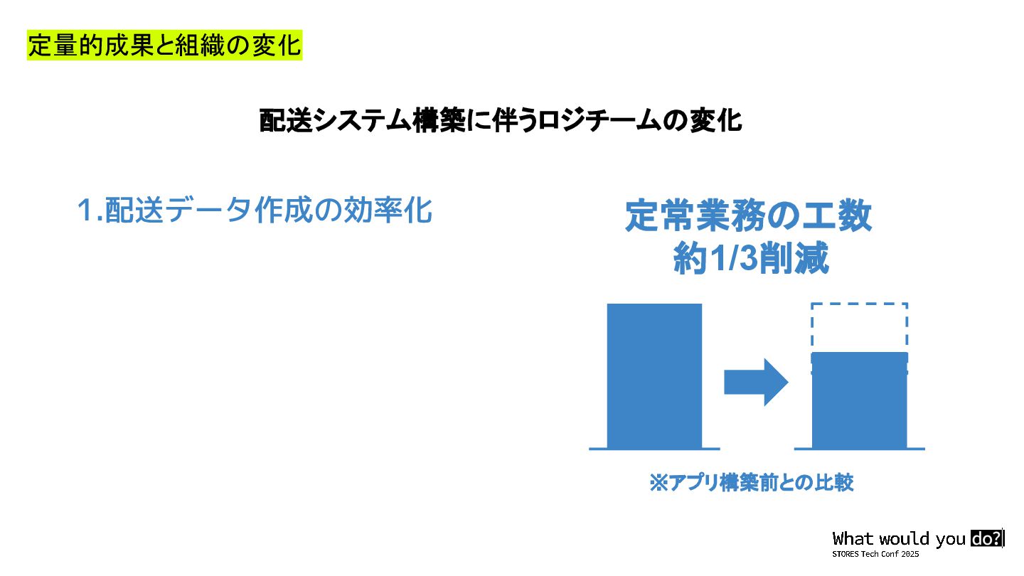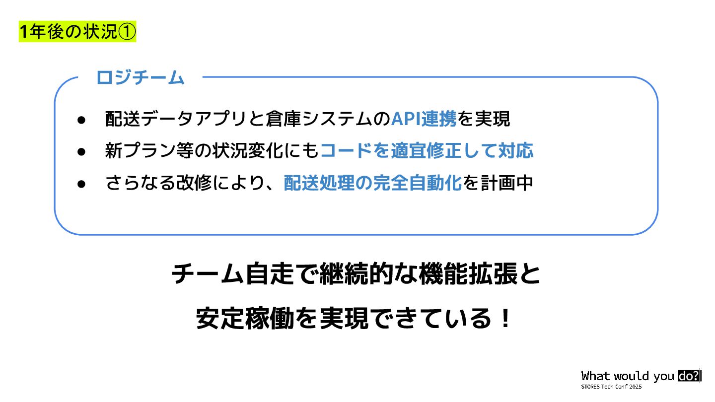 • 配送データアプリと倉庫システムのAPI連携を実現 • 新プラン等の状況変化にもコードを適宜修正して対応 • さらなる改修により、配送処理の完全自動化を計画中 ロジチーム チーム自走で継続的な機能拡張と 安定稼働を実現できている! 1年後の状況①