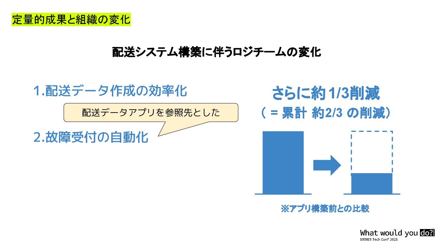 定量的成果と組織の変化 1.配送データ作成の効率化 2.故障受付の自動化 配送システム構築に伴うロジチームの変化 配送データアプリを参照先とした ※アプリ構築前との比較 さらに約1/3削減 ( = 累計