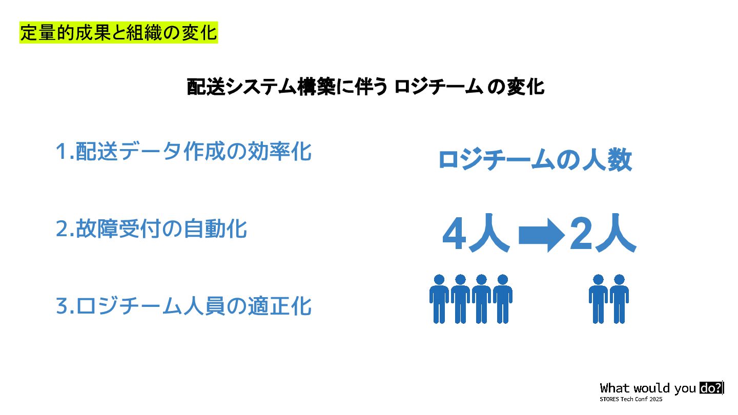 配送システム構築に伴う ロジチーム の変化 定量的成果と組織の変化 1.配送データ作成の効率化 2.故障受付の自動化 3.ロジチーム人員の適正化 ロジチームの人数 4人 2人