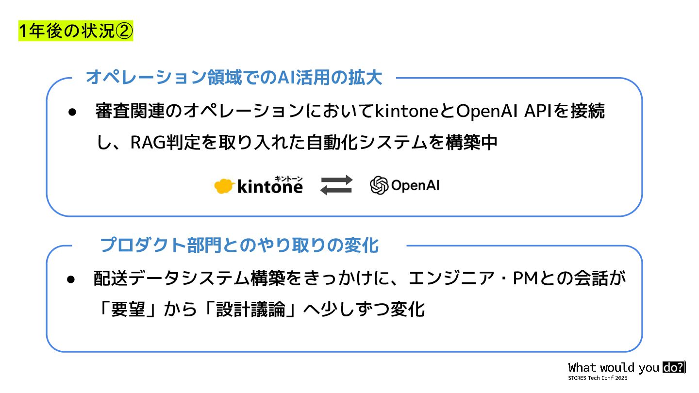 • 審査関連のオペレーションにおいてkintoneとOpenAI APIを接続 し、RAG判定を取り入れた自動化システムを構築中 オペレーション領域でのAI活用の拡大 • 配送データシステム構築をきっかけに、エンジニア・PMとの会話が 「要望」から「設計議論」へ少しずつ変化 プロダクト部門とのやり取りの変化 1年後の状況②