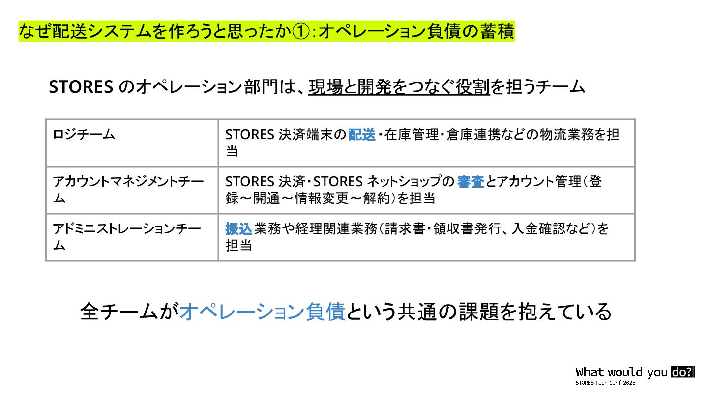 ネットショップの審査とアカウント管理(登 録〜開通〜情報変更〜解約)を担当 アドミニストレーションチー ム 振込業務や経理関連業務(請求書・領収書発行、入金確認など)を 担当 全チームがオペレーション負債という共通の課題を抱えている なぜ配送システムを作ろうと思ったか①:オペレーション負債の蓄積