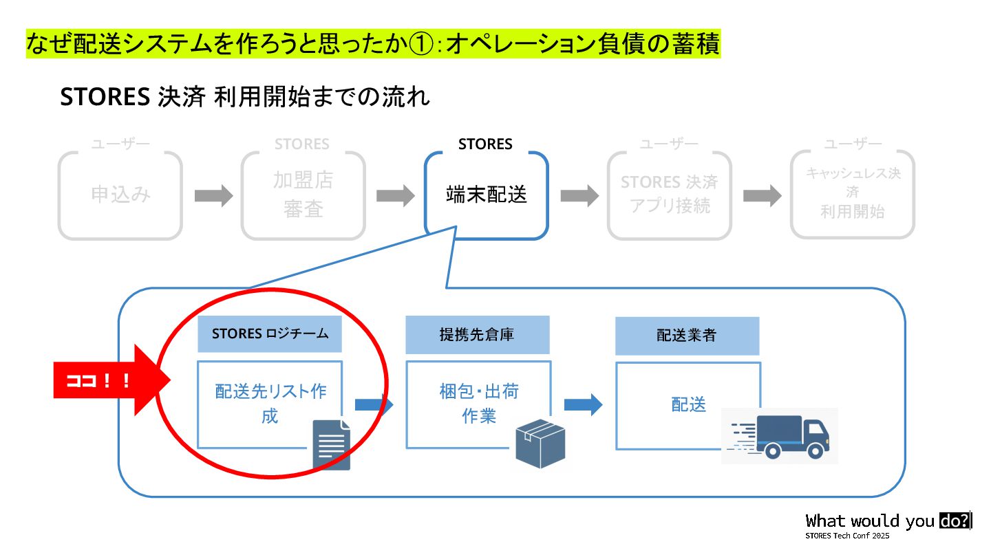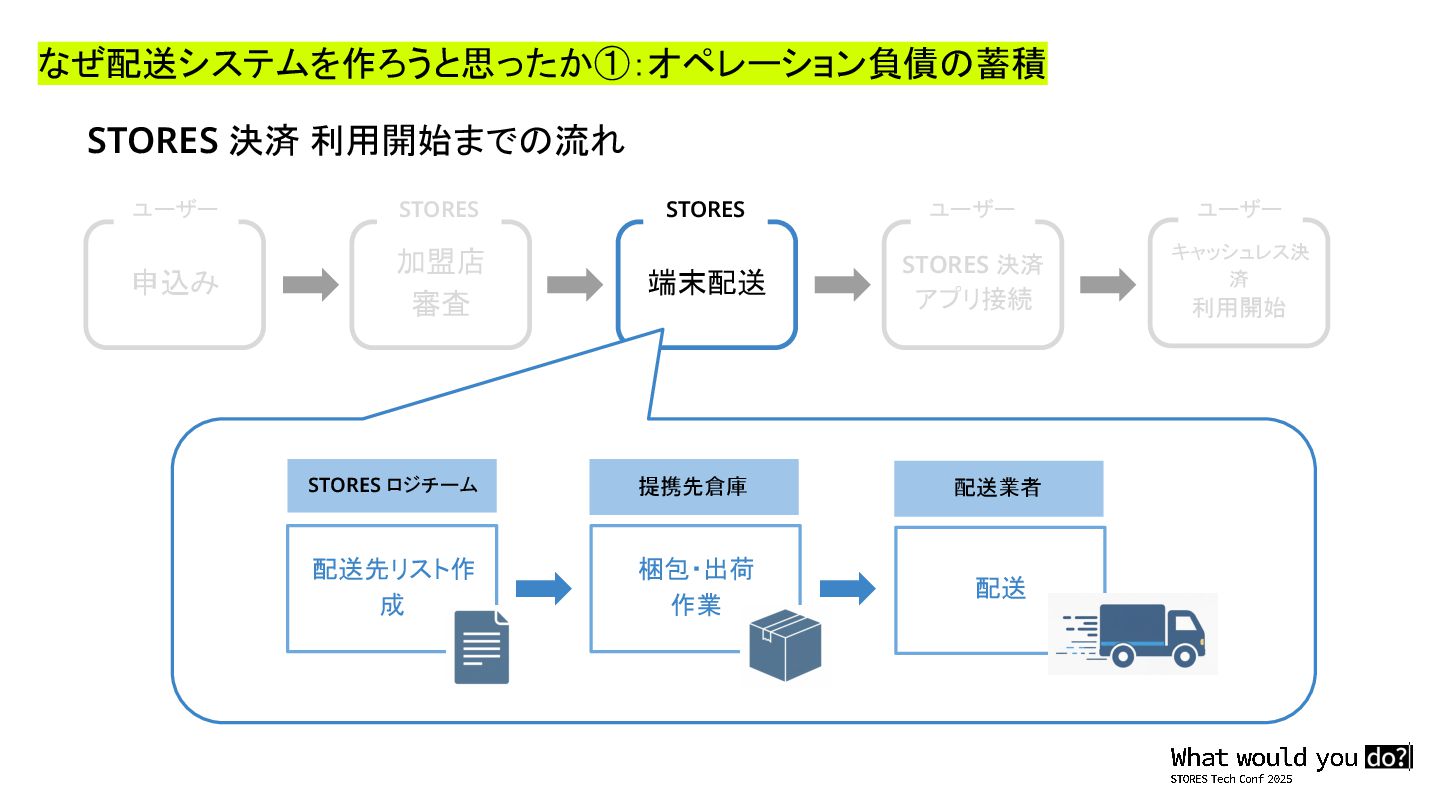 端末配送 STORES 決済 利用開始までの流れ なぜ配送システムを作ろうと思ったか①:オペレーション負債の蓄積 申込み 加盟店 審査 STORES 決済