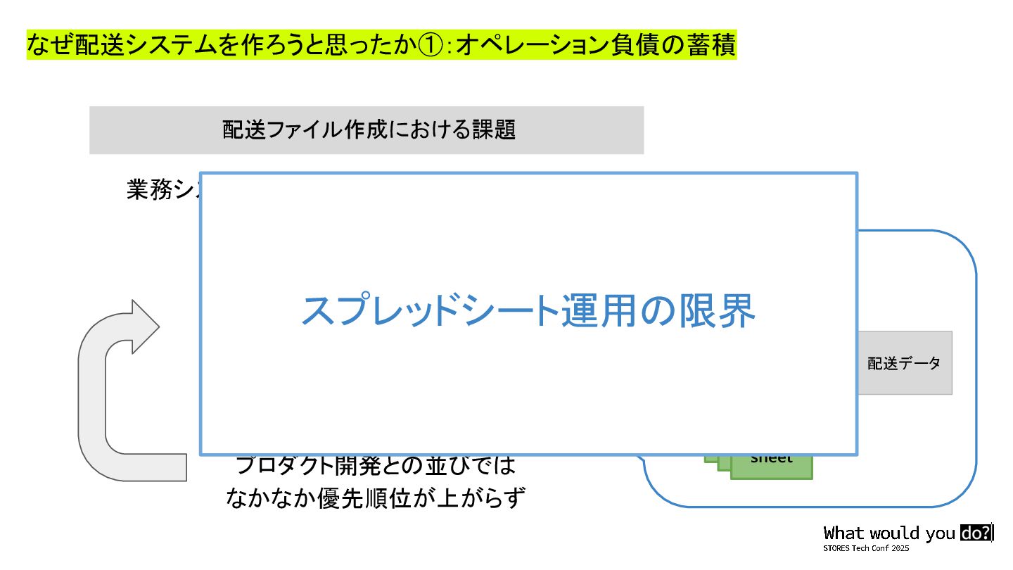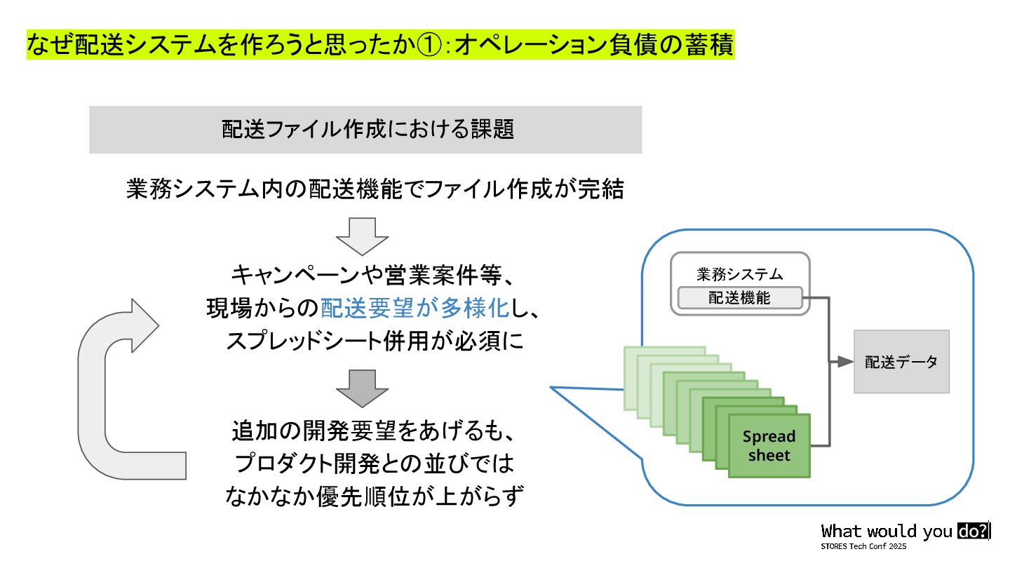 プロダクト開発との並びでは なかなか優先順位が上がらず 配送データ Spread sheet 配送ファイル作成における課題 なぜ配送システムを作ろうと思ったか①:オペレーション負債の蓄積