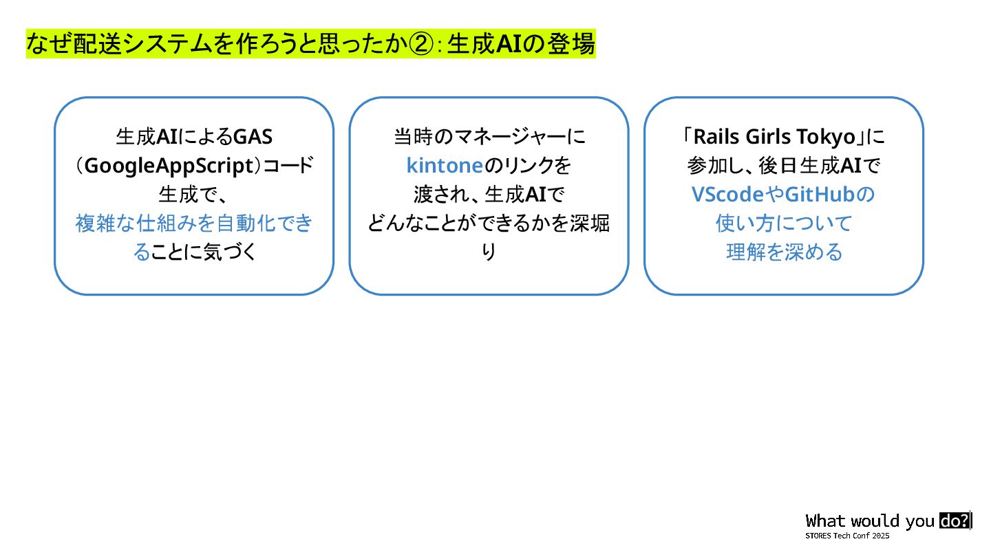 渡され、生成AIで どんなことができるかを深堀 り 「Rails Girls Tokyo」に 参加し、後日生成AIで VScodeやGitHubの 使い方について 理解を深める なぜ配送システムを作ろうと思ったか②:生成AIの登場