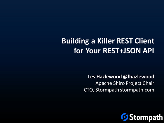 In this presentation, Les Hazlewood - Stormpath CTO and Apache Shiro PMC Chair - will share all of the golden nuggets learned while designing, implementing and supporting multiple clients purpose-built for a real-world REST+JSON API.