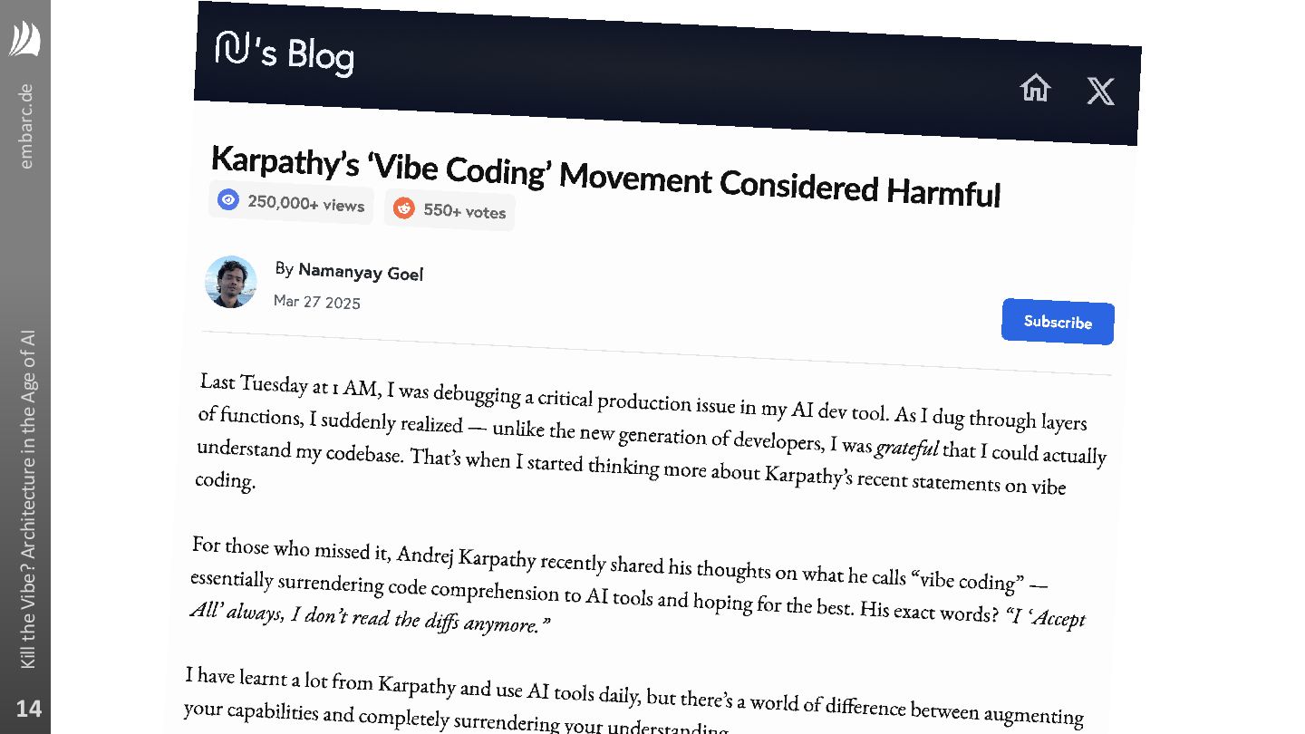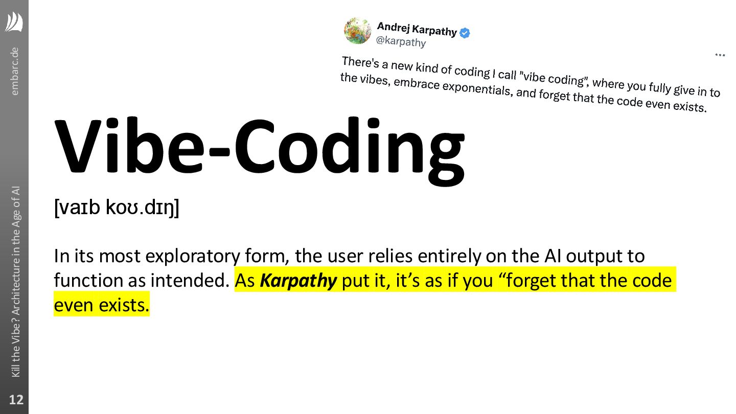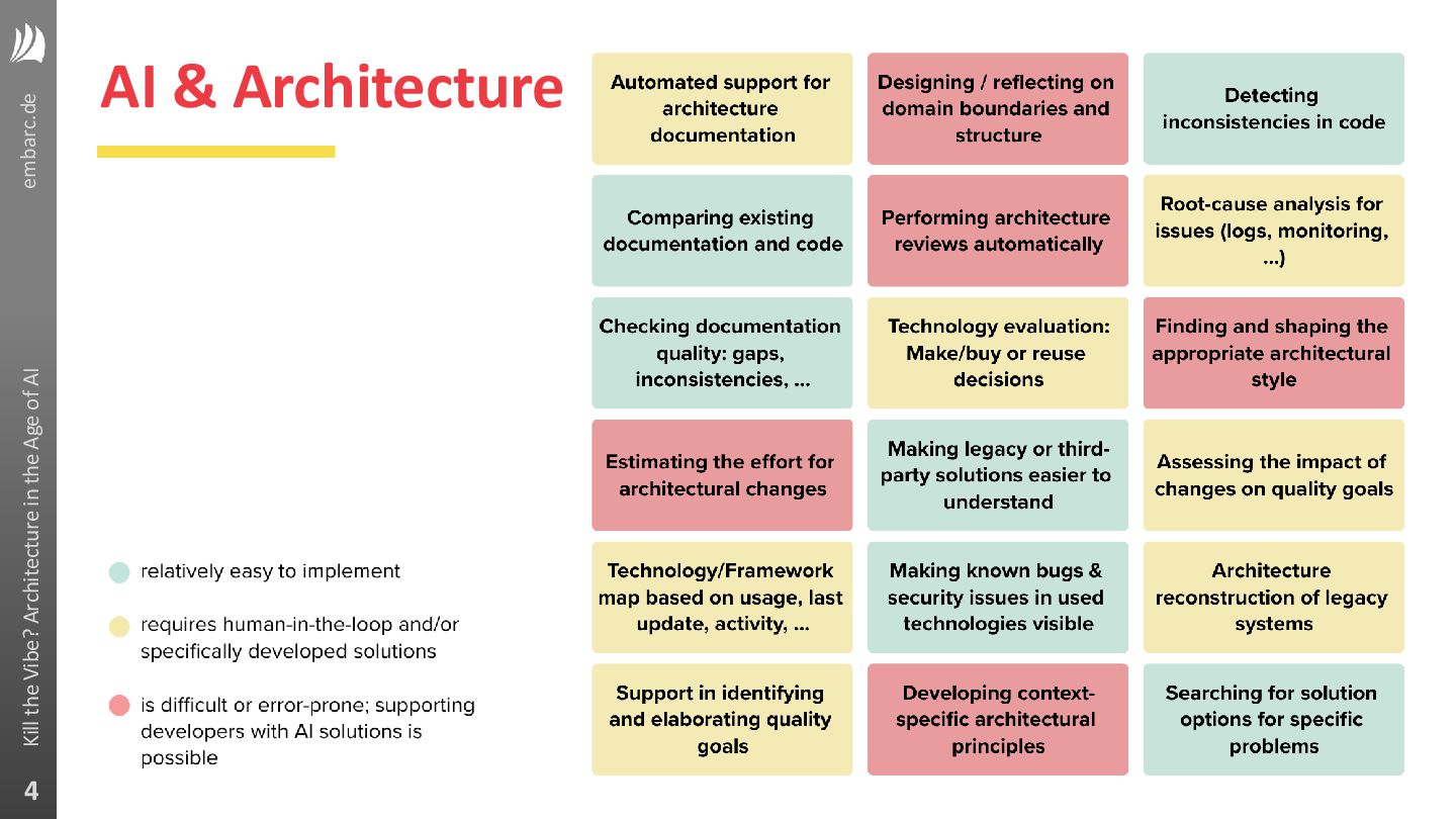 AI is changing how we write software — but what about software architecture? Vibe Coding with LLMs enables quick results, but often creates emergent structures that are difficult to understand. In a world where systems can be built cheaply, architectural work isn’t becoming less important—it’s becoming essential: cycles are shorter, feedback is faster, and design and implementation are more tightly intertwined.