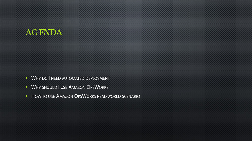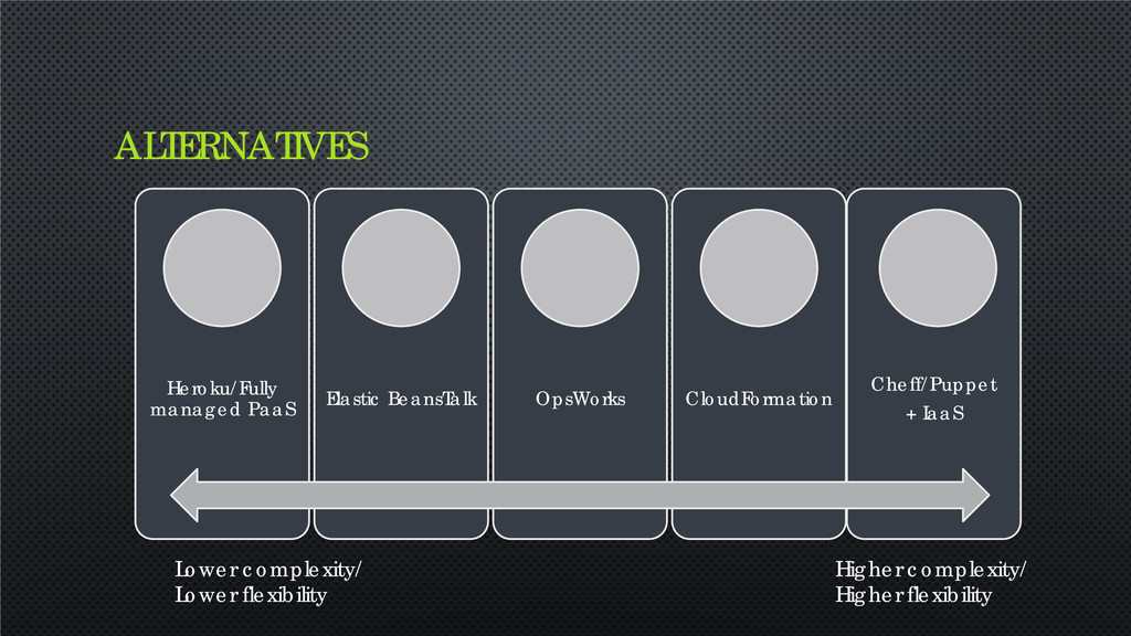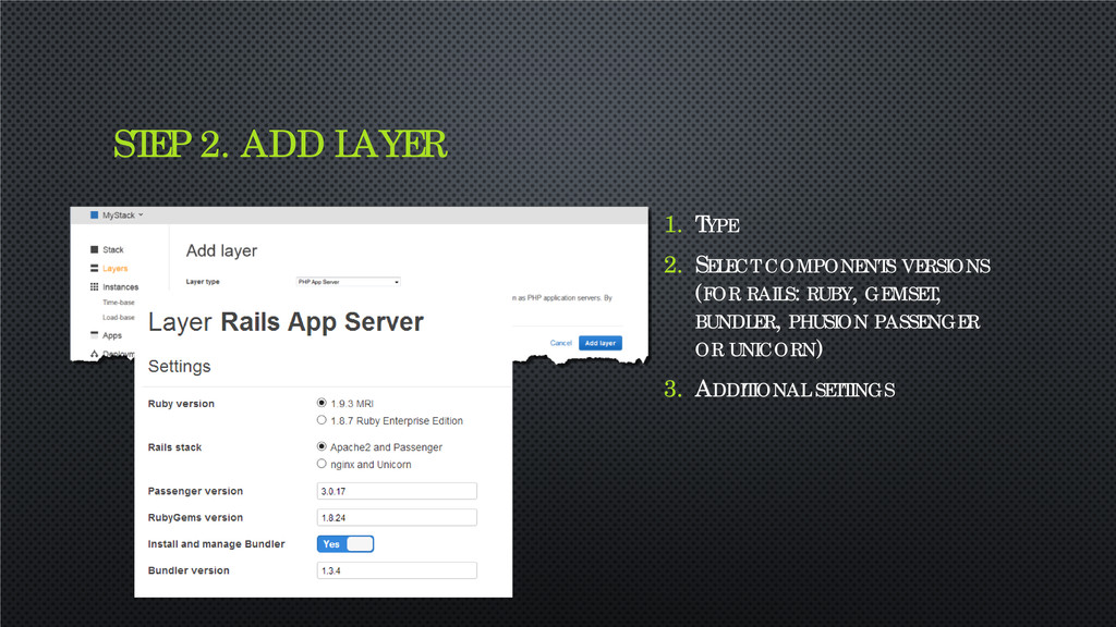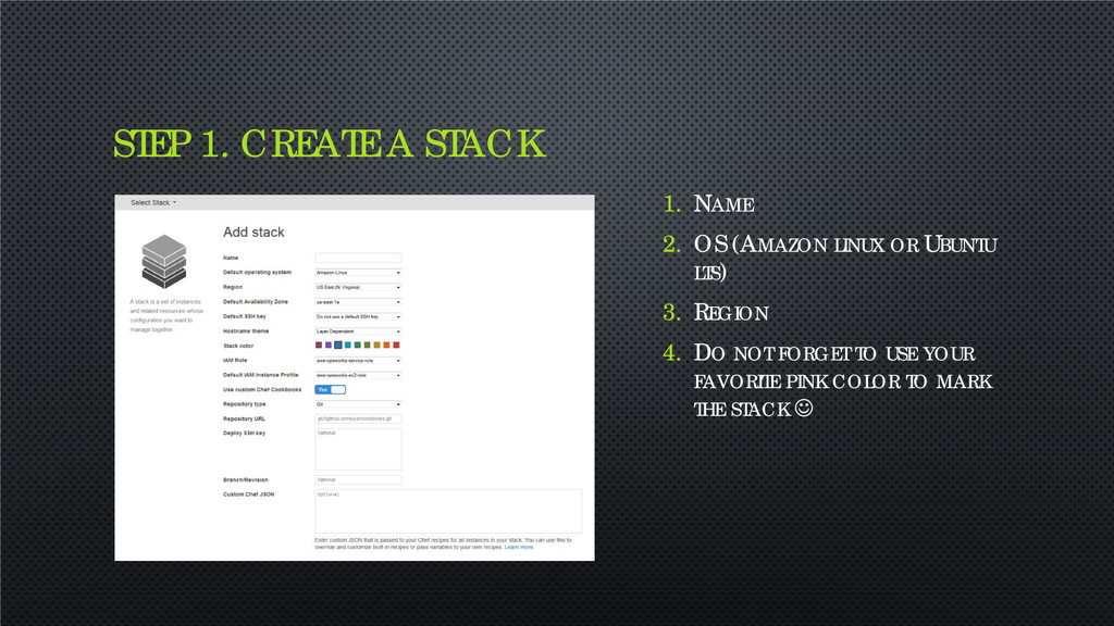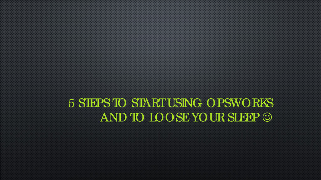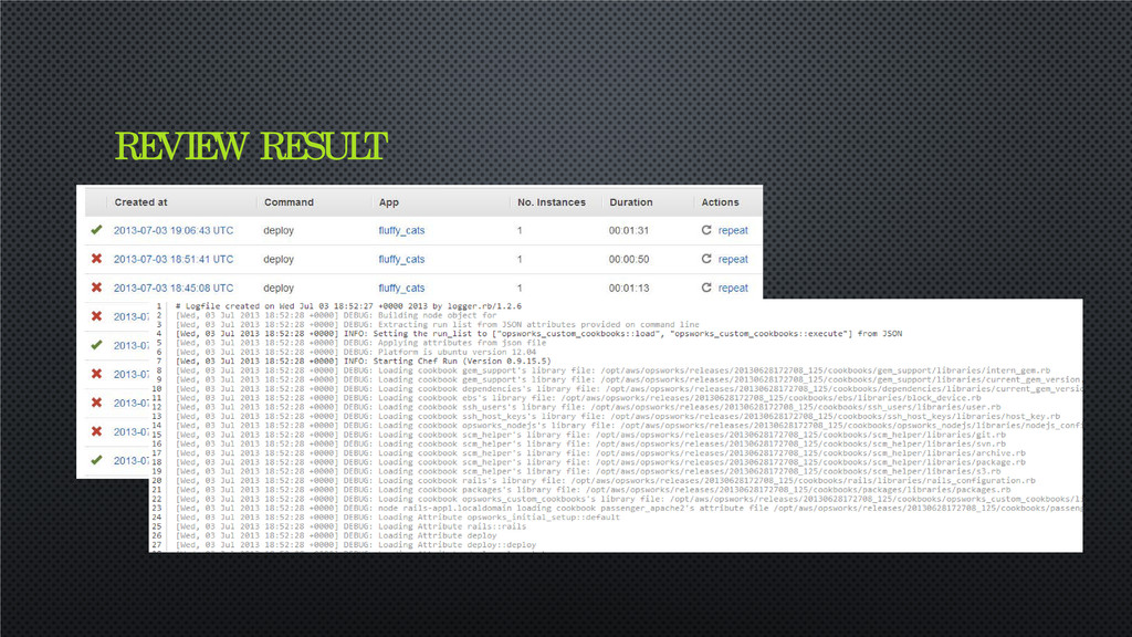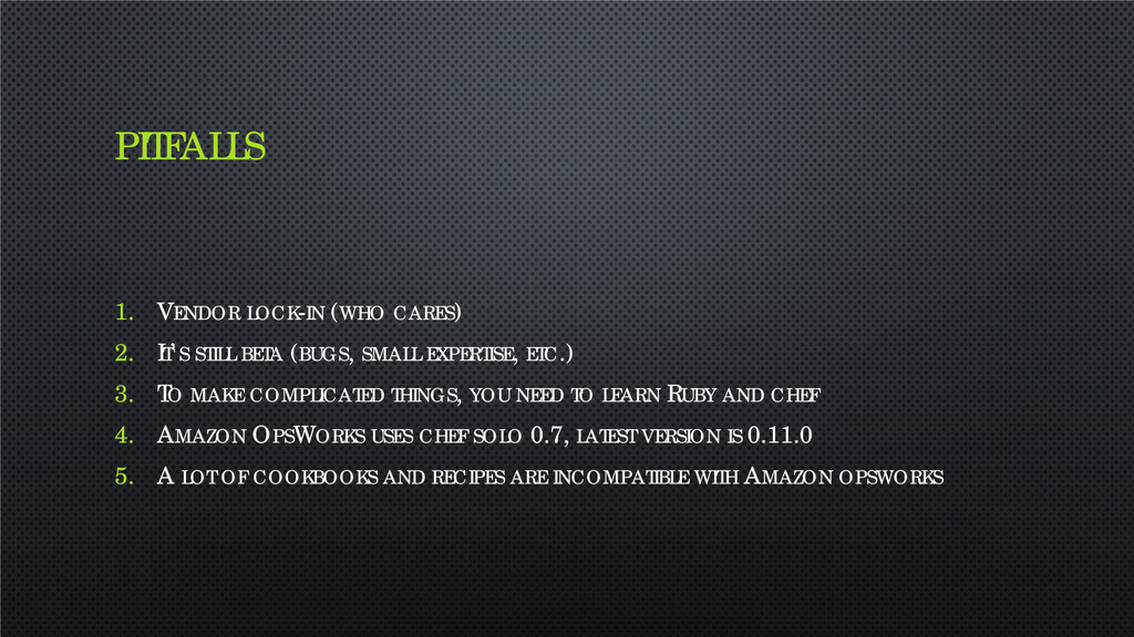 (BUGS, SMALL EXPERTISE, ETC.) 3. TO MAKE COMPLICATED THINGS, YOU NEED TO LEARN RUBY AND CHEF 4. AMAZON OPSWORKS USES CHEF SOLO 0.7, LATEST VERSION IS 0.11.0 5. A LOT OF COOKBOOKS AND RECIPES ARE INCOMPATIBLE WITH AMAZON OPSWORKS