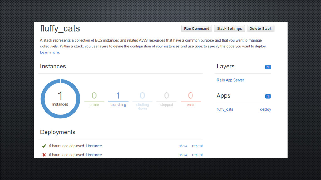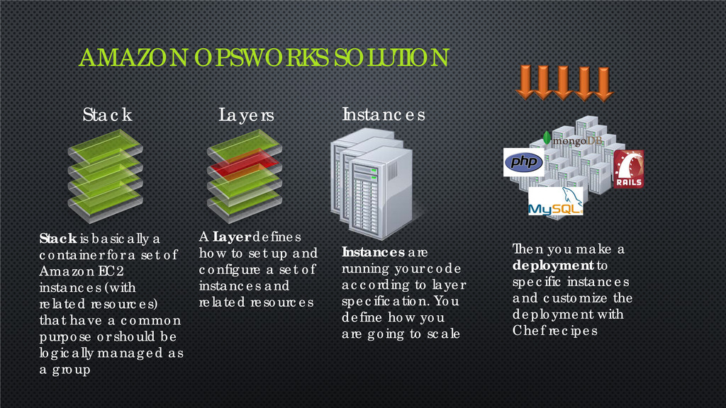 for a set of Amazon EC2 instances (with related resources) that have a common purpose or should be logically managed as a group A Layer defines how to set up and configure a set of instances and related resources Instances Instances are running your code according to layer specification. You define how you are going to scale Then you make a deployment to specific instances and customize the deployment with Chef recipes