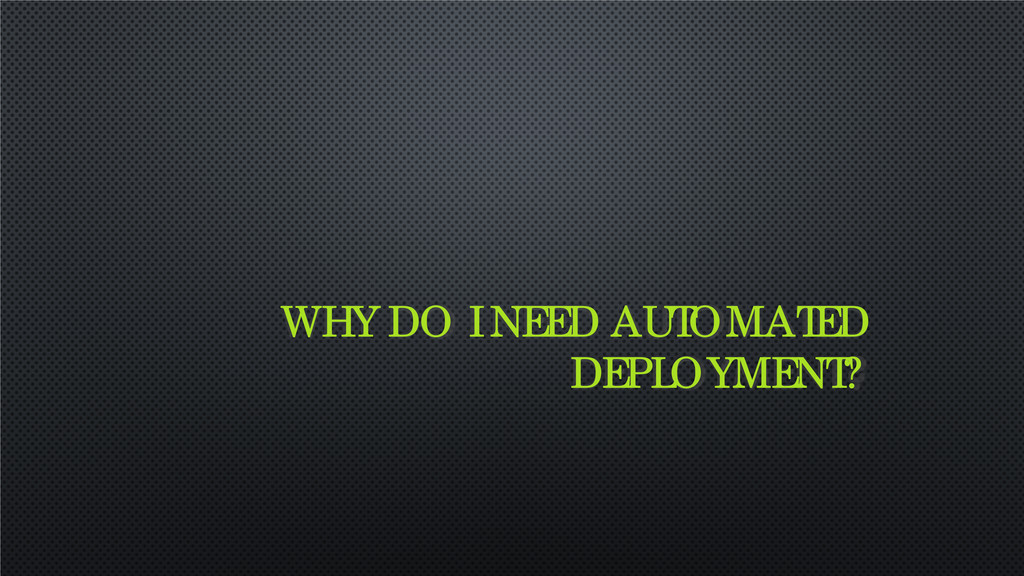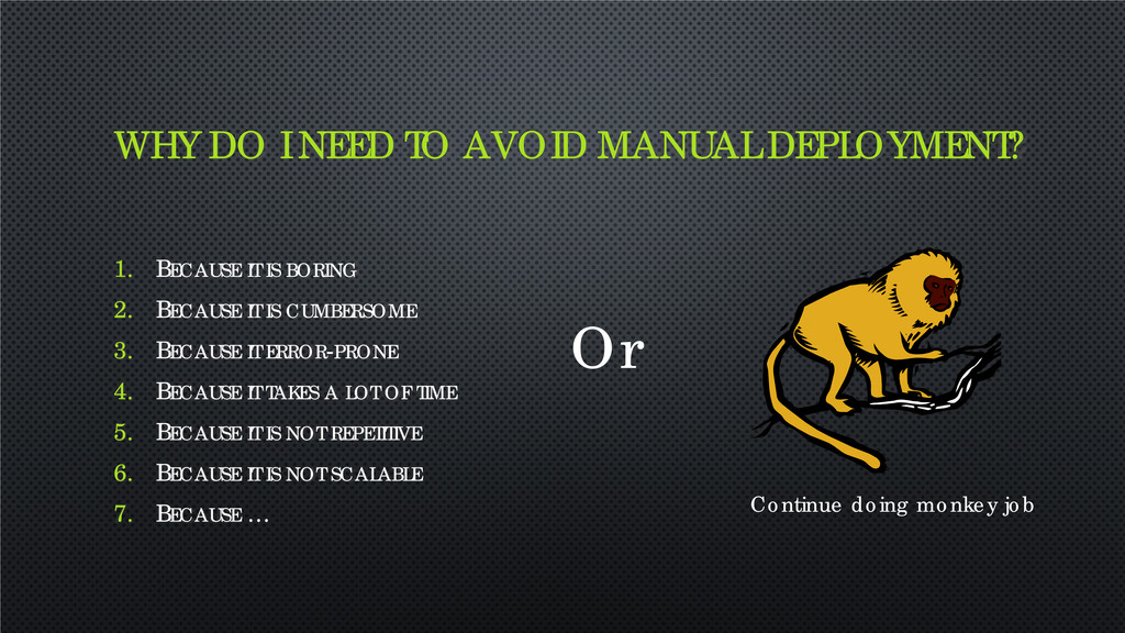 IT IS BORING 2. BECAUSE IT IS CUMBERSOME 3. BECAUSE IT ERROR-PRONE 4. BECAUSE IT TAKES A LOT OF TIME 5. BECAUSE IT IS NOT REPETITIVE 6. BECAUSE IT IS NOT SCALABLE 7. BECAUSE … Or Continue doing monkey job