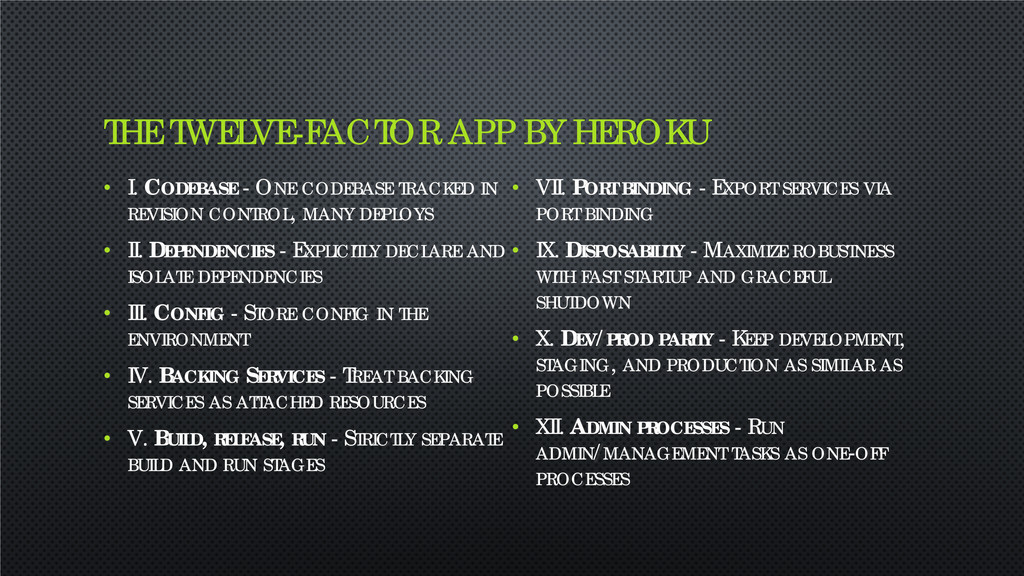 CODEBASE TRACKED IN REVISION CONTROL, MANY DEPLOYS • II. DEPENDENCIES - EXPLICITLY DECLARE AND ISOLATE DEPENDENCIES • III. CONFIG - STORE CONFIG IN THE ENVIRONMENT • IV. BACKING SERVICES - TREAT BACKING SERVICES AS ATTACHED RESOURCES • V. BUILD, RELEASE, RUN - STRICTLY SEPARATE BUILD AND RUN STAGES • VII. PORT BINDING - EXPORT SERVICES VIA PORT BINDING • IX. DISPOSABILITY - MAXIMIZE ROBUSTNESS WITH FAST STARTUP AND GRACEFUL SHUTDOWN • X. DEV/PROD PARITY - KEEP DEVELOPMENT, STAGING, AND PRODUCTION AS SIMILAR AS POSSIBLE • XII. ADMIN PROCESSES - RUN ADMIN/MANAGEMENT TASKS AS ONE-OFF PROCESSES