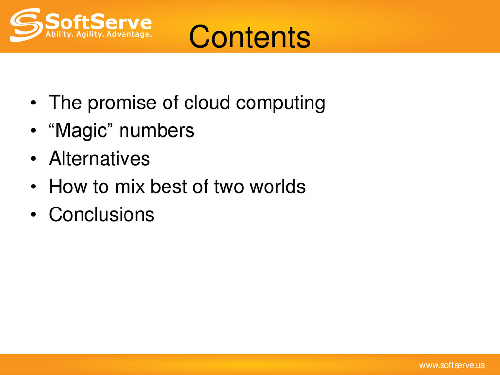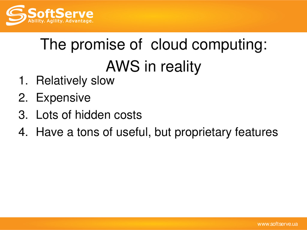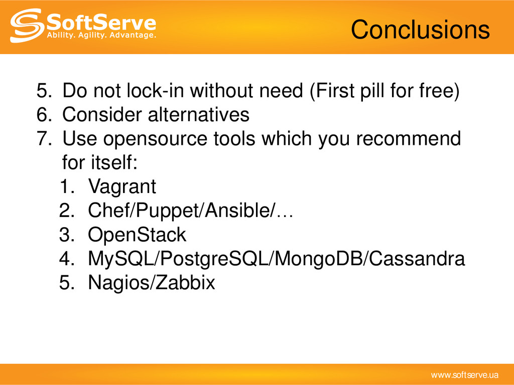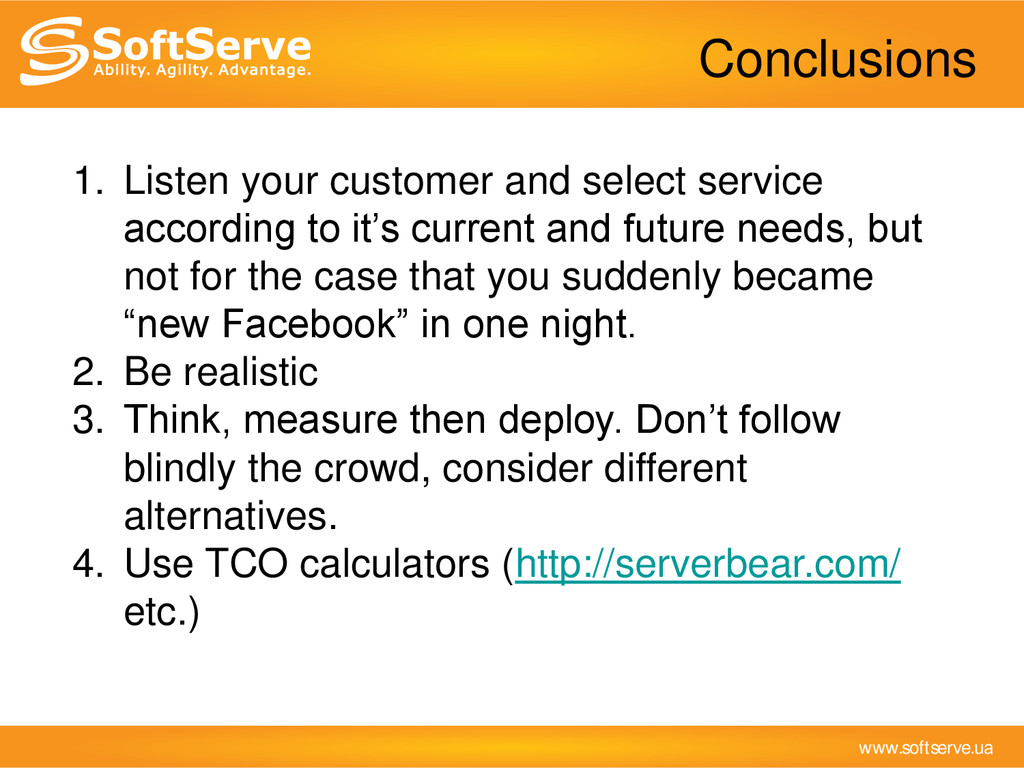 it’s current and future needs, but not for the case that you suddenly became “new Facebook” in one night. 2. Be realistic 3. Think, measure then deploy. Don’t follow blindly the crowd, consider different alternatives. 4. Use TCO calculators (http://serverbear.com/ etc.) Conclusions