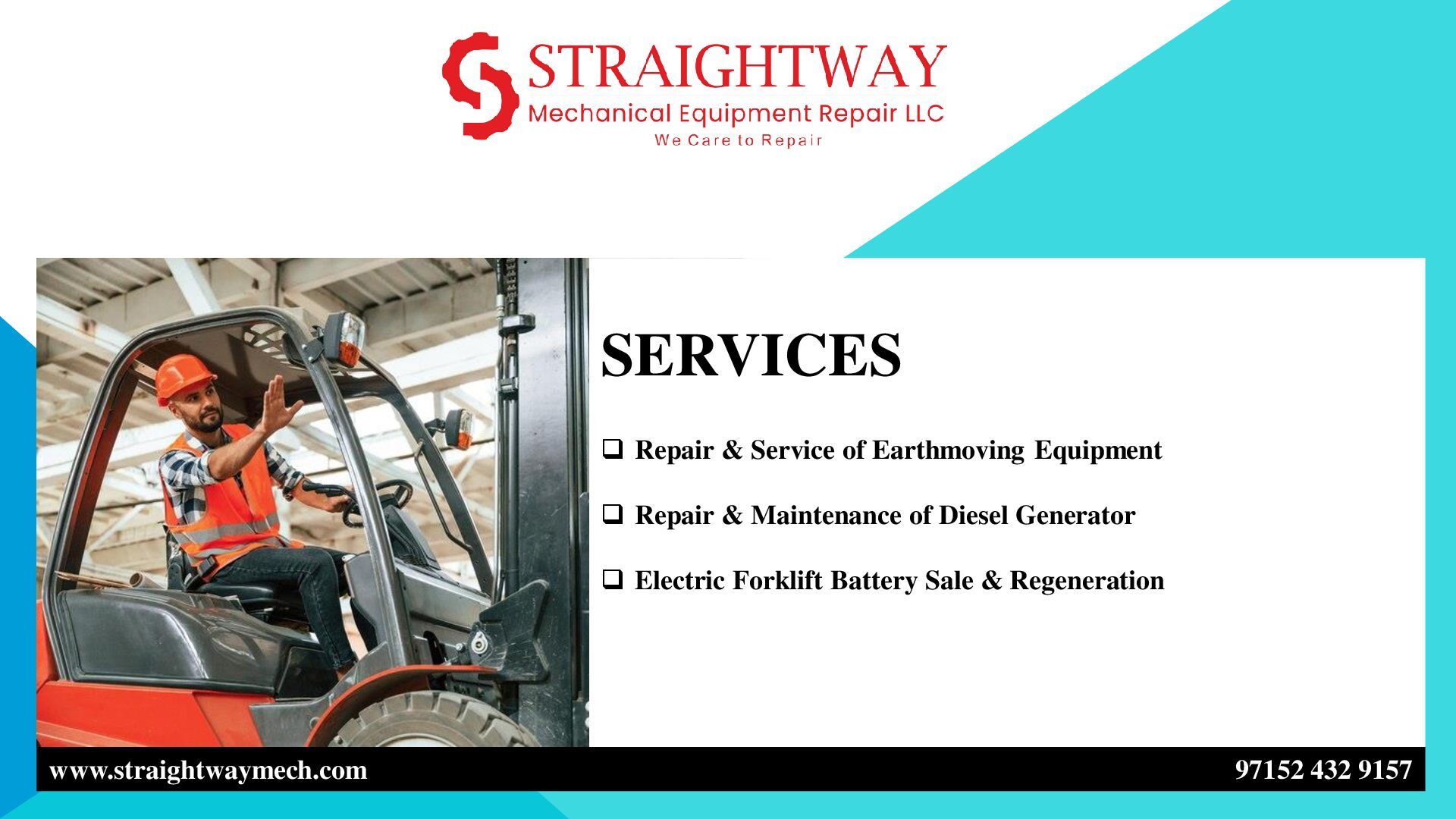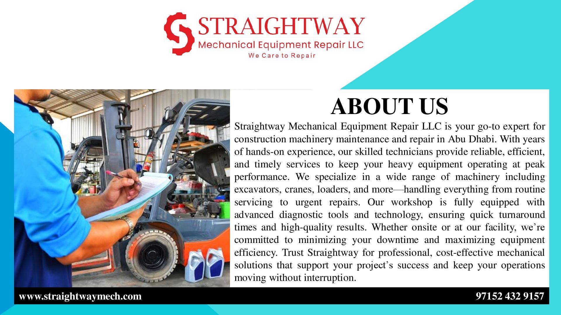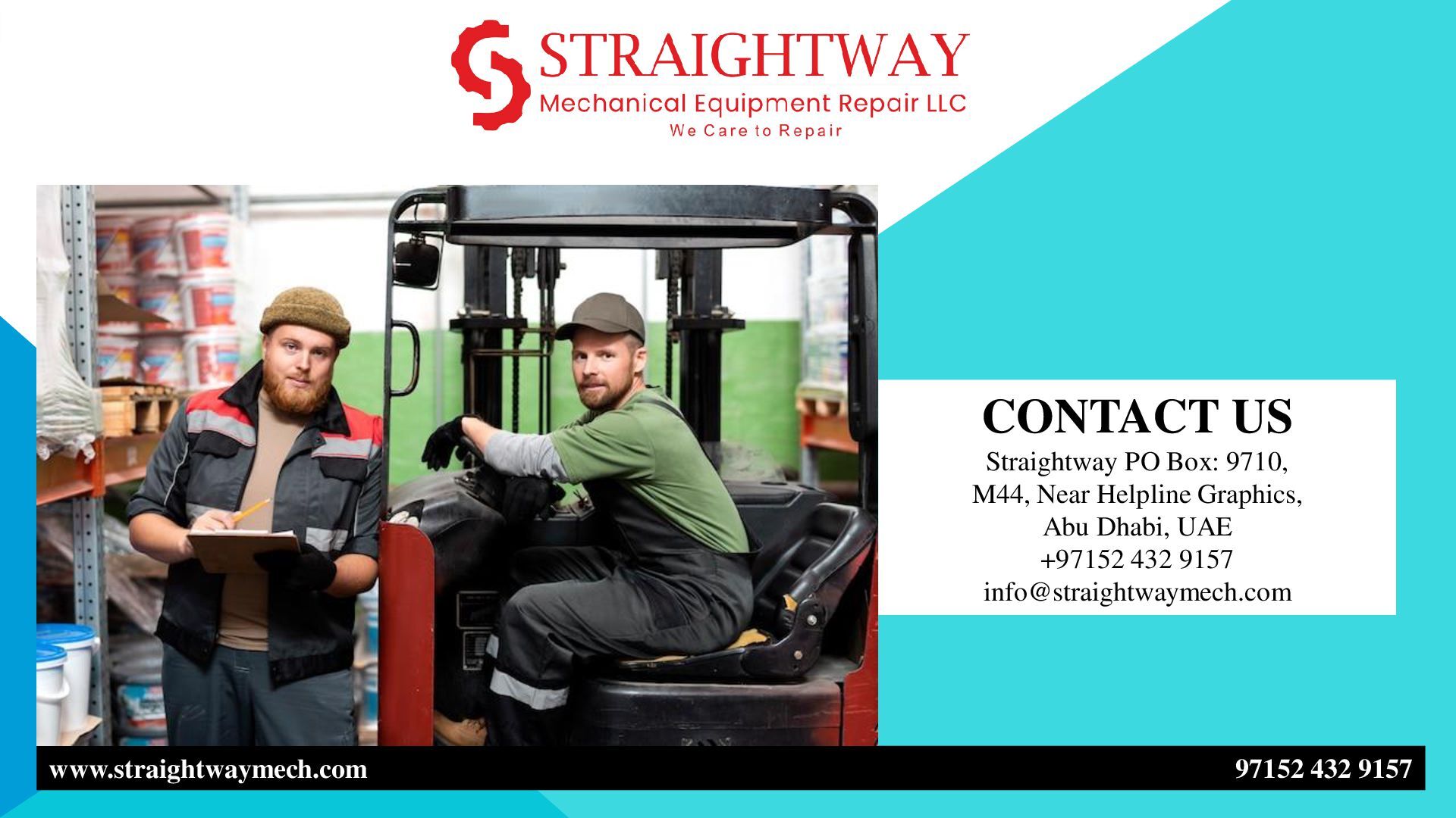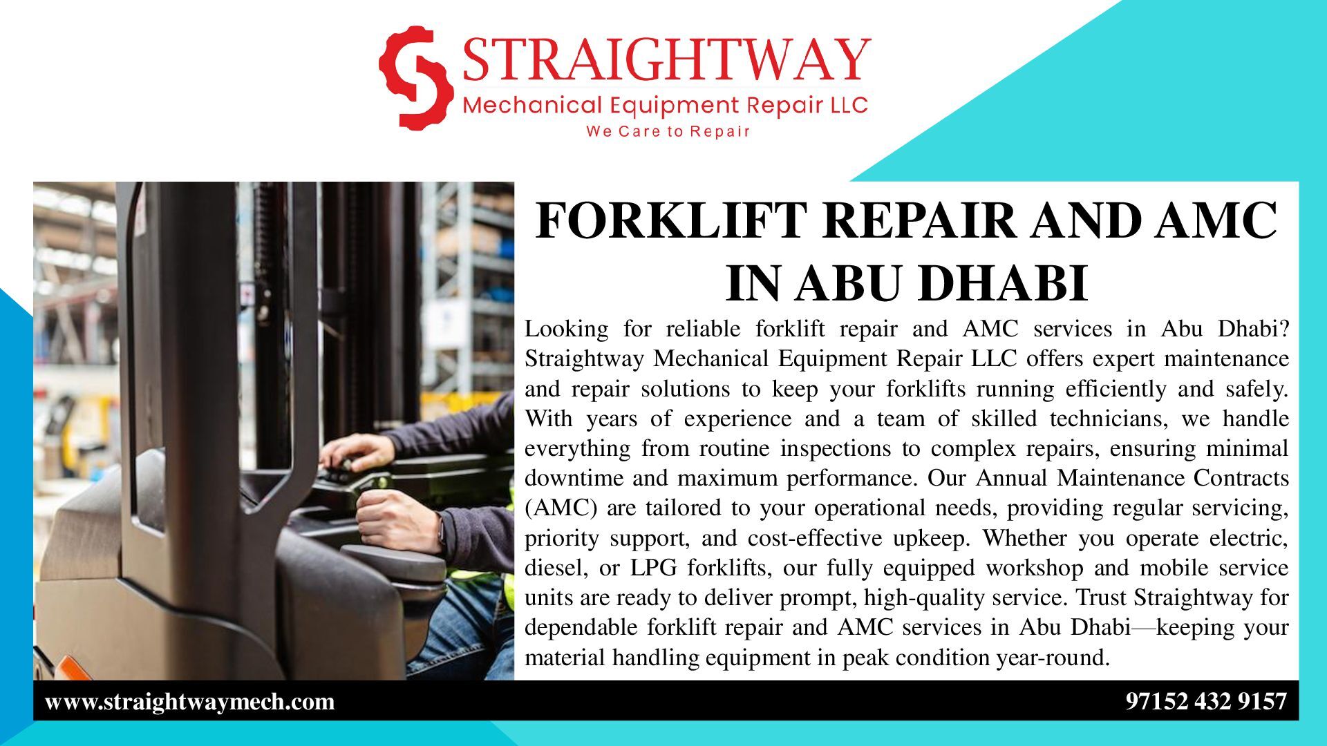 DHABI Looking for reliable forklift repair and AMC services in Abu Dhabi? Straightway Mechanical Equipment Repair LLC offers expert maintenance and repair solutions to keep your forklifts running efficiently and safely. With years of experience and a team of skilled technicians, we handle everything from routine inspections to complex repairs, ensuring minimal downtime and maximum performance. Our Annual Maintenance Contracts (AMC) are tailored to your operational needs, providing regular servicing, priority support, and cost-effective upkeep. Whether you operate electric, diesel, or LPG forklifts, our fully equipped workshop and mobile service units are ready to deliver prompt, high-quality service. Trust Straightway for dependable forklift repair and AMC services in Abu Dhabi—keeping your material handling equipment in peak condition year-round.