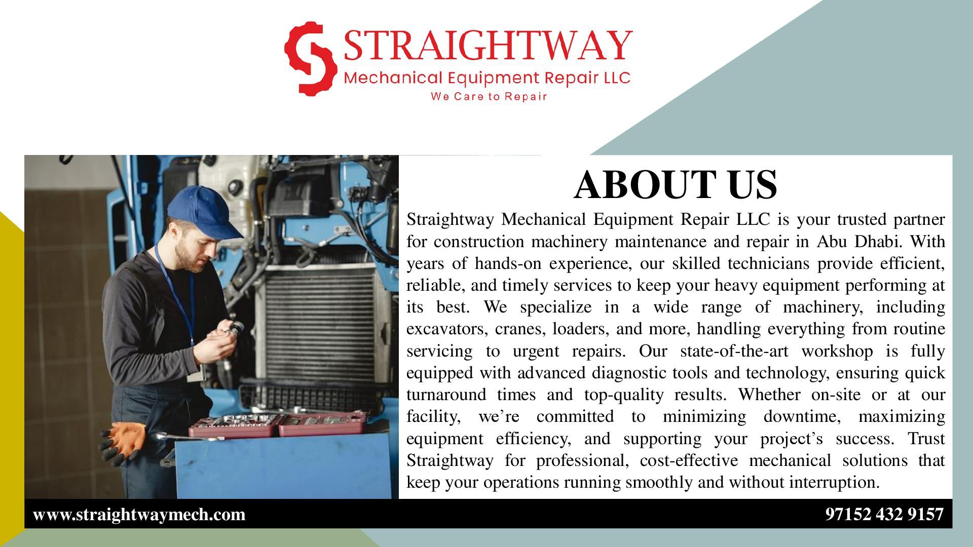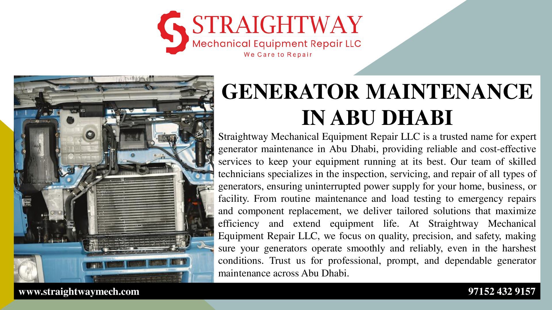 Mechanical Equipment Repair LLC is a trusted name for expert generator maintenance in Abu Dhabi, providing reliable and cost-effective services to keep your equipment running at its best. Our team of skilled technicians specializes in the inspection, servicing, and repair of all types of generators, ensuring uninterrupted power supply for your home, business, or facility. From routine maintenance and load testing to emergency repairs and component replacement, we deliver tailored solutions that maximize efficiency and extend equipment life. At Straightway Mechanical Equipment Repair LLC, we focus on quality, precision, and safety, making sure your generators operate smoothly and reliably, even in the harshest conditions. Trust us for professional, prompt, and dependable generator maintenance across Abu Dhabi.