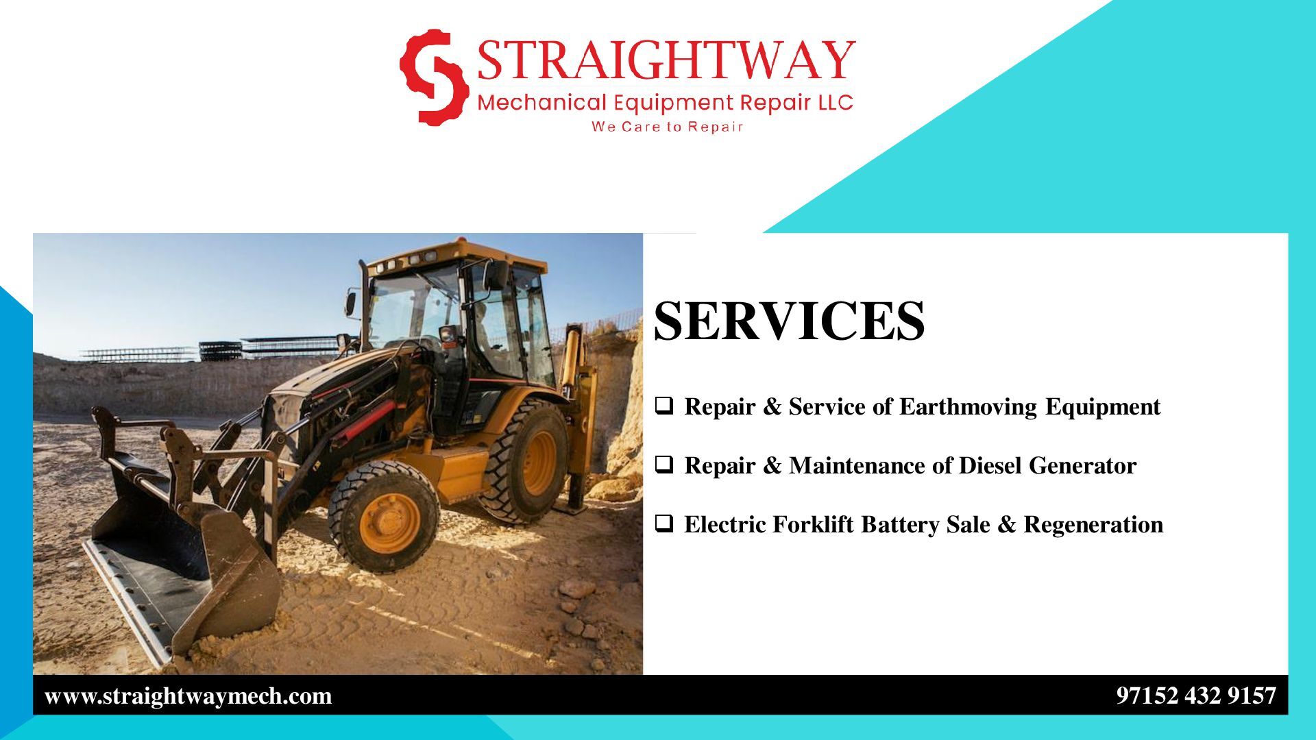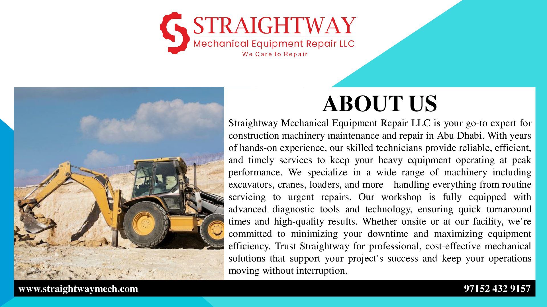 for reliable JCB repair services in Abu Dhabi? Straightway Mechanical Equipment Repair LLC specializes in professional maintenance and repair solutions for JCB machines, ensuring optimal performance and extended equipment life. Our experienced technicians handle all types of JCB repairs, including engine servicing, hydraulic system maintenance, electrical diagnostics, and part replacements. Equipped with advanced tools and genuine spare parts, we provide precise and efficient service for construction and industrial machinery. Committed to quality, safety, and timely execution, Straightway Mechanical Equipment Repair LLC ensures minimal downtime and maximum productivity for your equipment. Trust us in Abu Dhabi for dependable, cost-effective JCB repair solutions that keep your machinery running smoothly and efficiently.