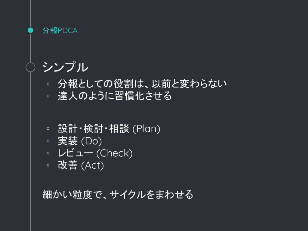 分報PDCA シンプル ◦ 分報としての役割は、以前と変わらない ◦ 達人のように習慣化させる ◦ 設計・検討・相談 (Plan) ◦