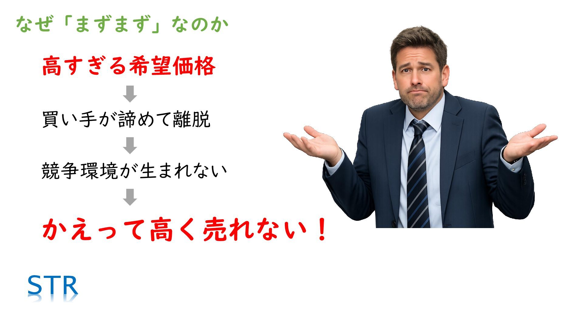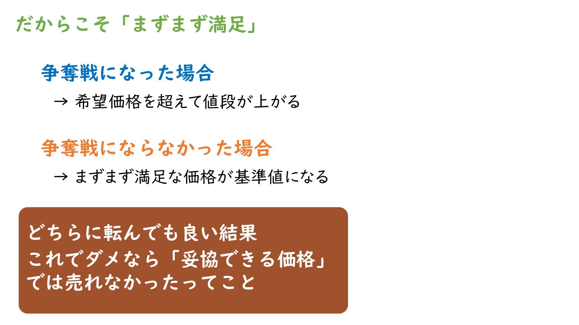 ③「まずまず満足な価格」を伝える方法 → 一番のおすすめ。買い手の参入障壁を上げすぎず、争奪戦が起きれば希望価格を超える高値が付く可能性も。争奪戦が起きなくても納得感のある水準で売却判断ができる