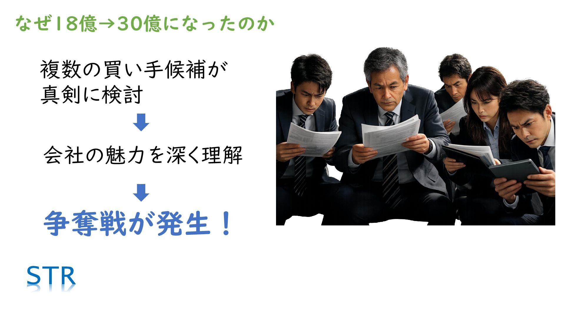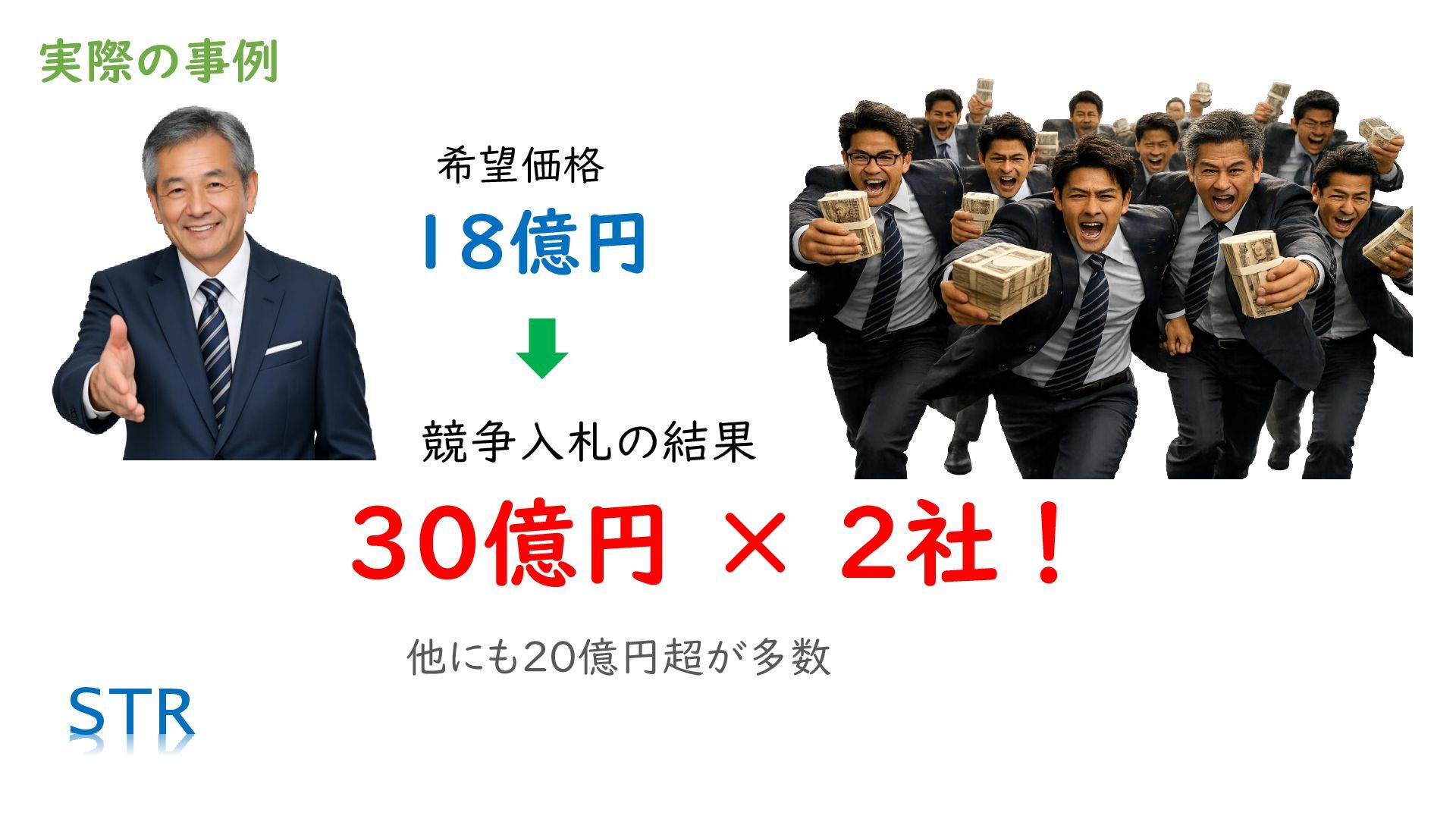 希望価格18億円で開始した案件が、複数の買い手による争奪戦の結果、30億円の入札が2件入った事例を紹介。競争入札と質の高いインフォメーションメモランダムの効果を実証しています。
