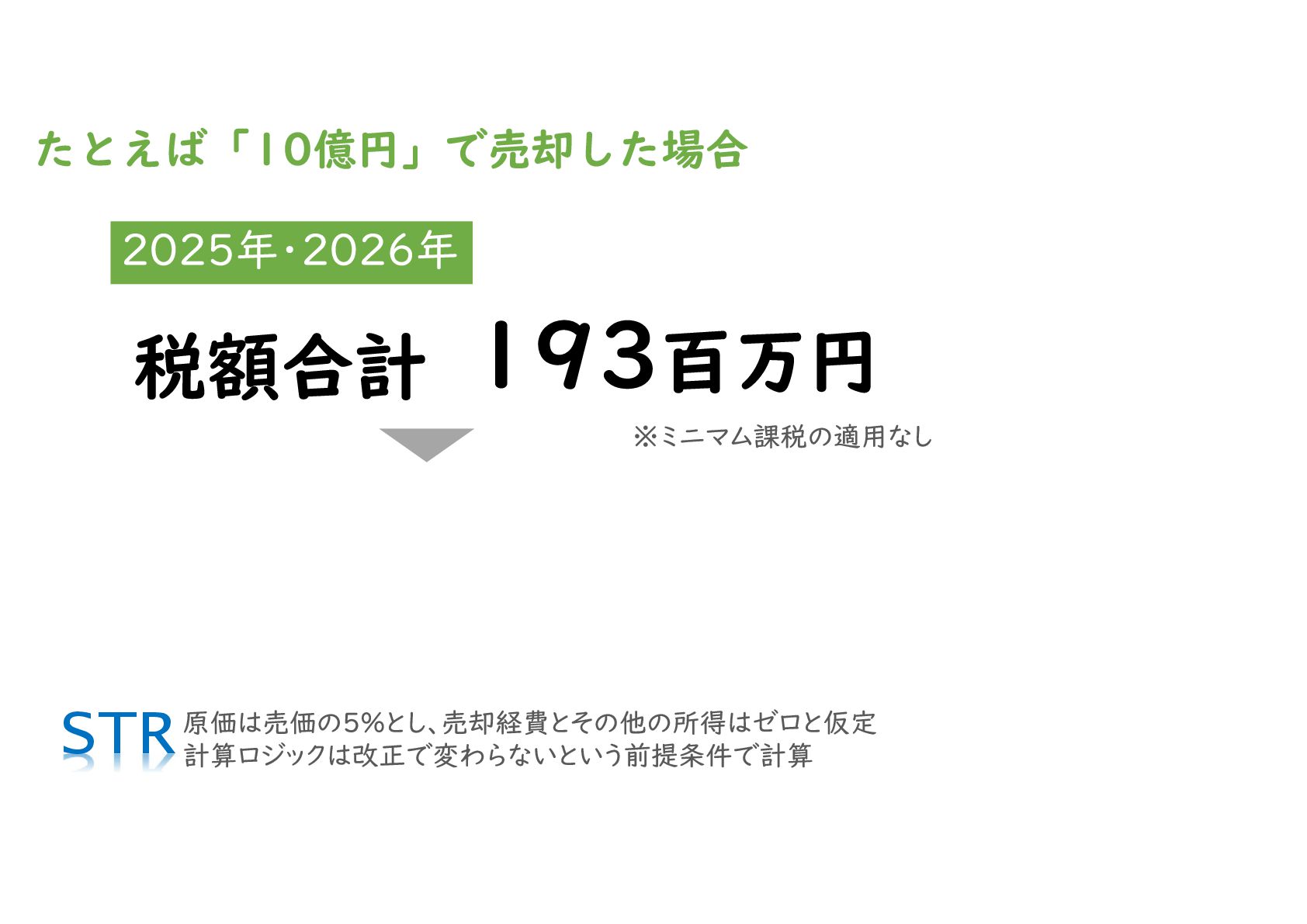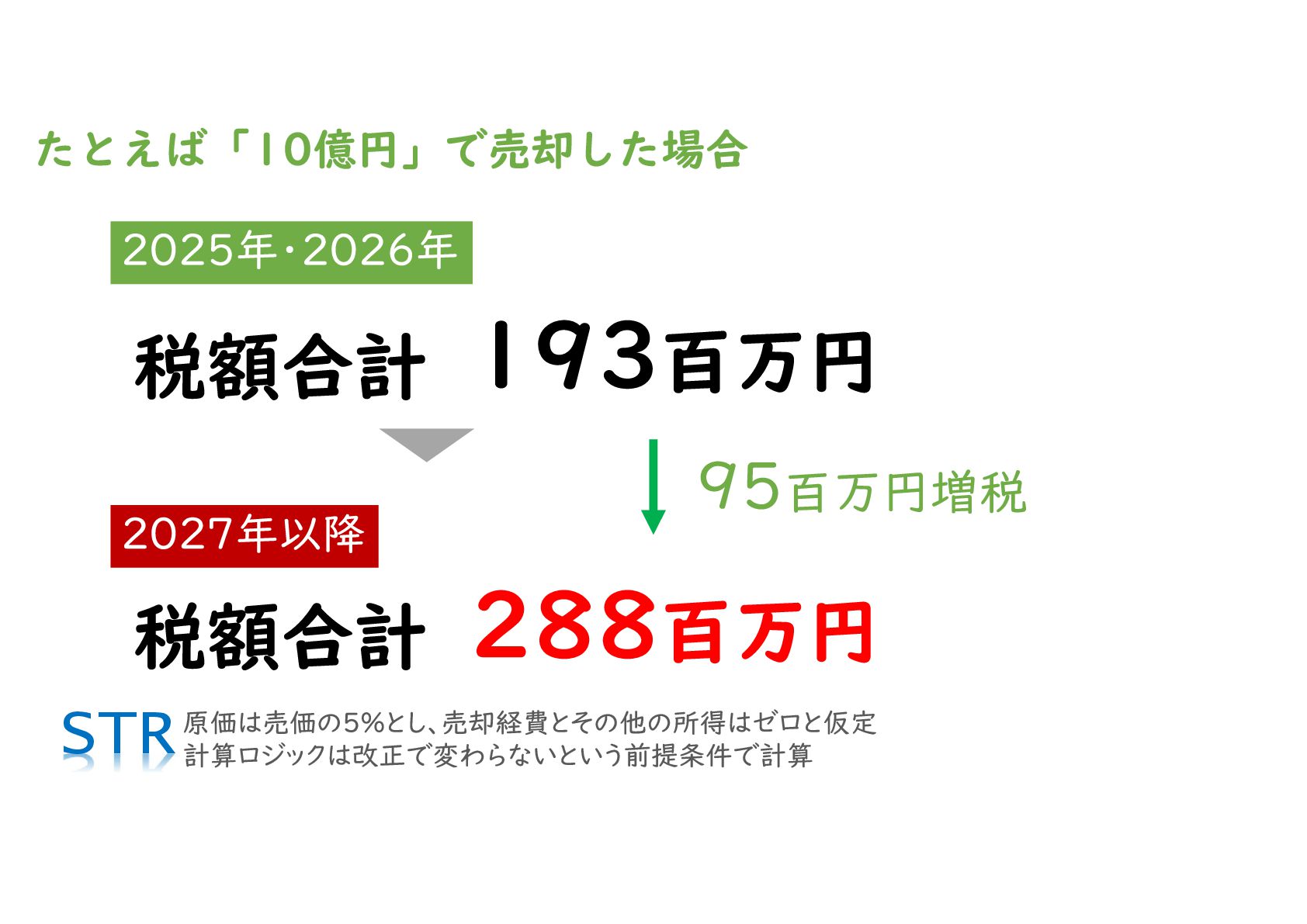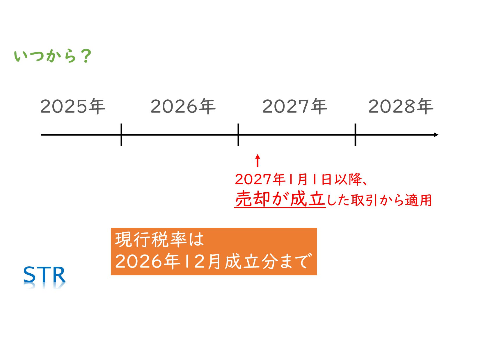 適用開始時期:2027年1月1日以降に成立した取引から適用されます。2026年中の売却であれば、現行税制になります。