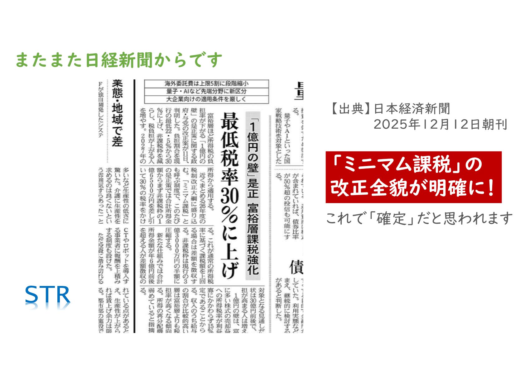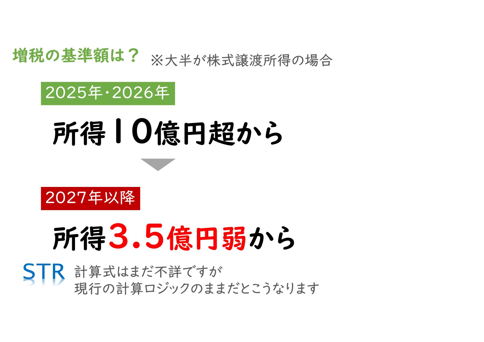 対象者の拡大:これまでは「所得10億円超(大半が株式譲渡益の場合)」が主な対象でしたが、2027年以降は「所得3.5億円弱」から増税の影響を受ける設計となります。