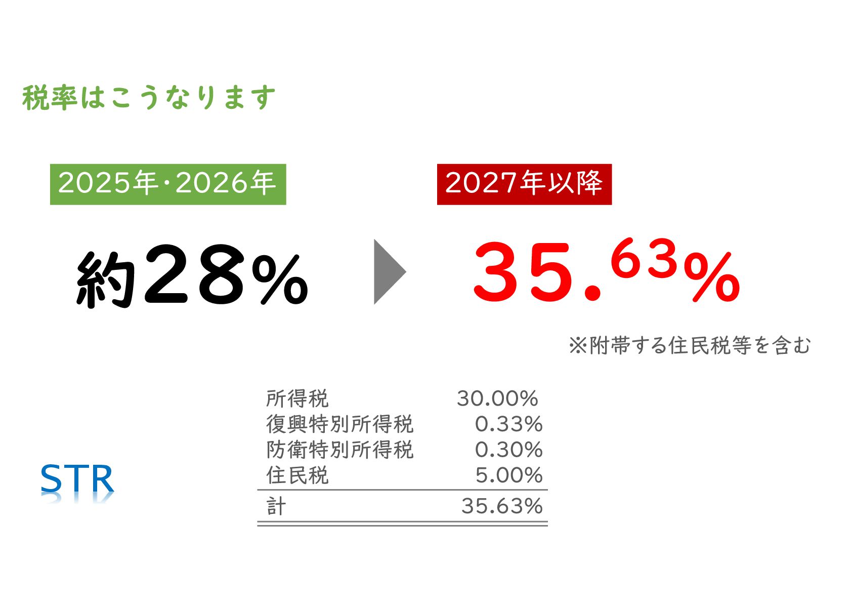 税率の引き上げ:2027年以降、基準を超える所得に対する税率は、復興特別所得税や住民税を含めると35.63%となります。これは法人税の実効税率を上回る水準です。