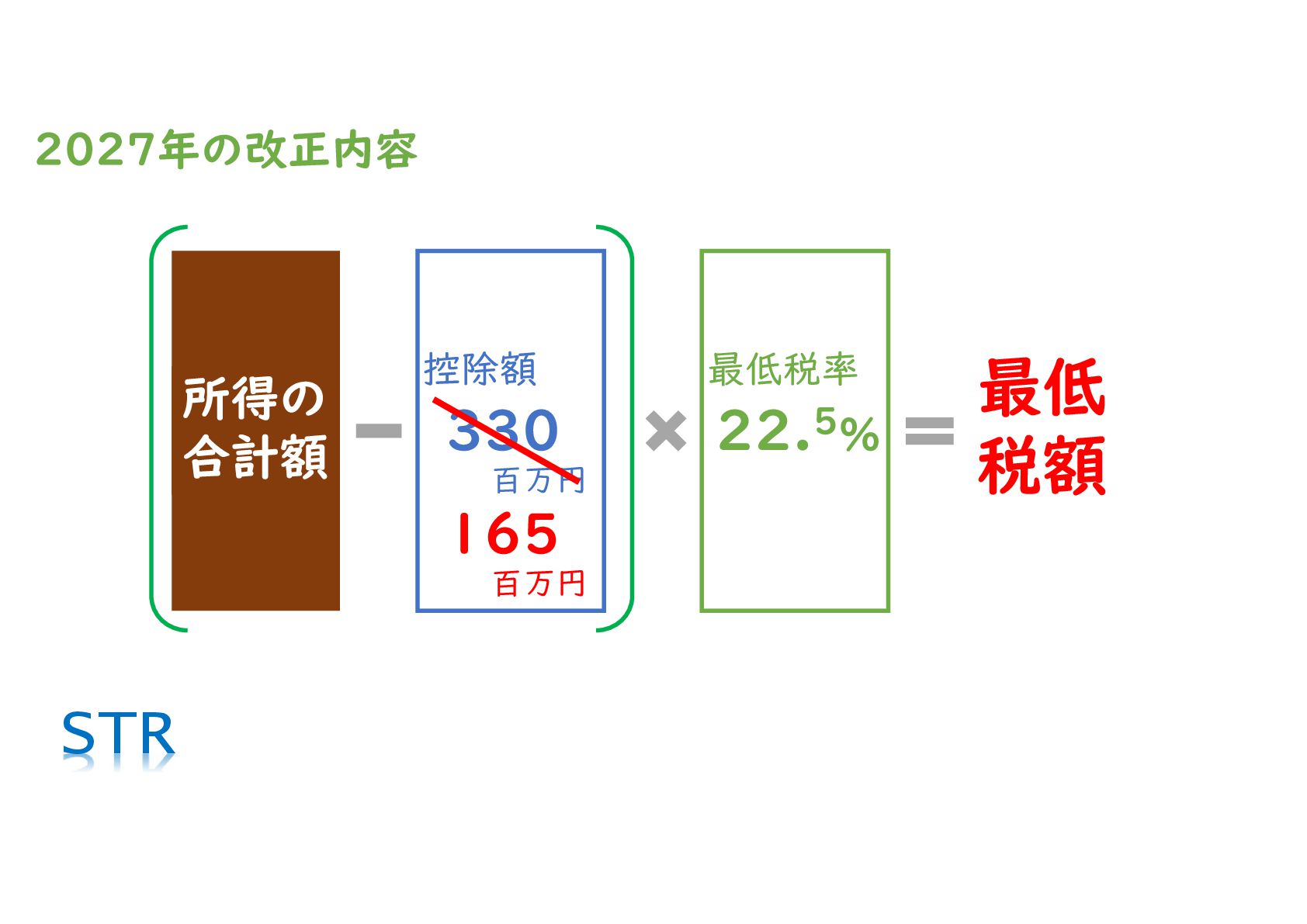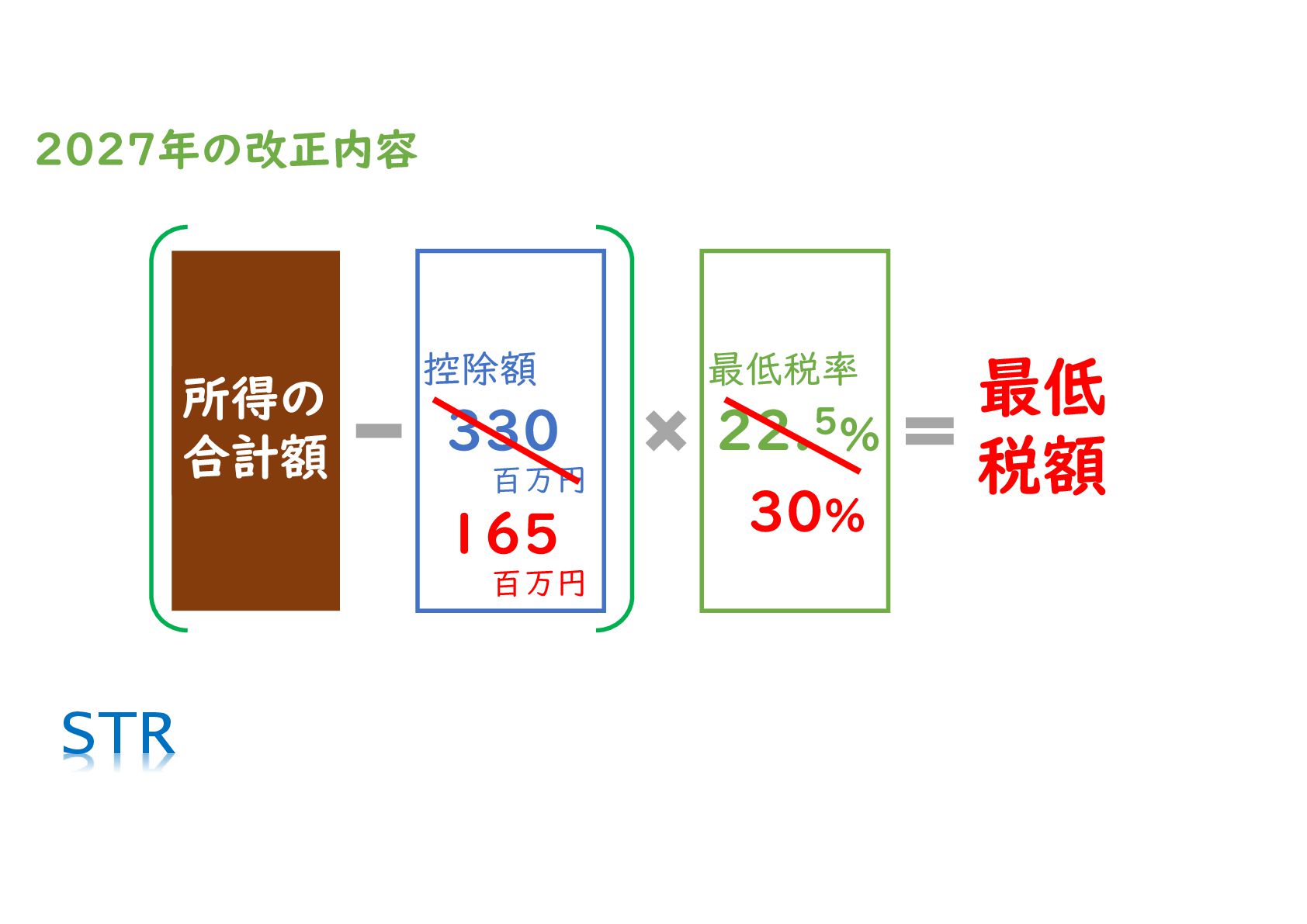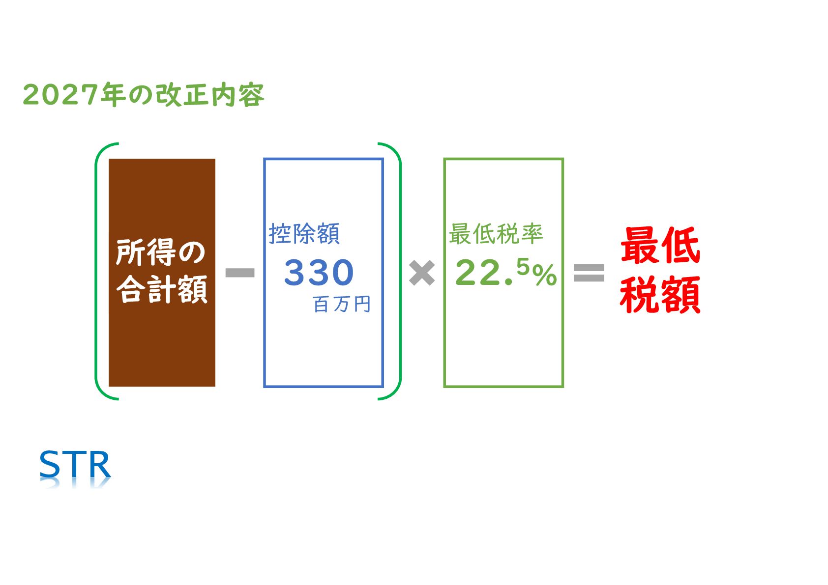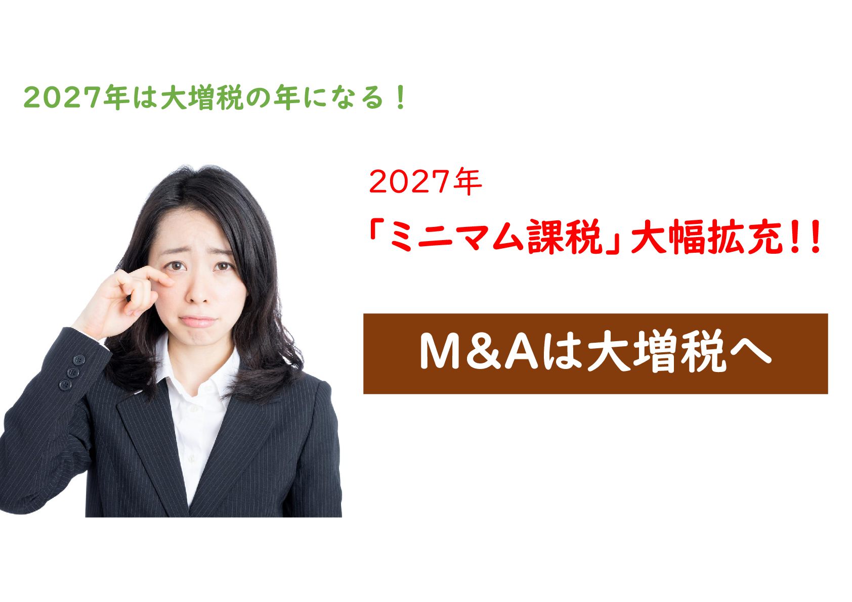 2027年より、高額所得者を対象とした「ミニマム課税(最低税率制度)」が大幅に拡張されます 。これにより、大型案件だけでなく3億円を超えるような中小企業のM&Aでも、税負担が数千万円〜数億円単位で激増する可能性があります 。