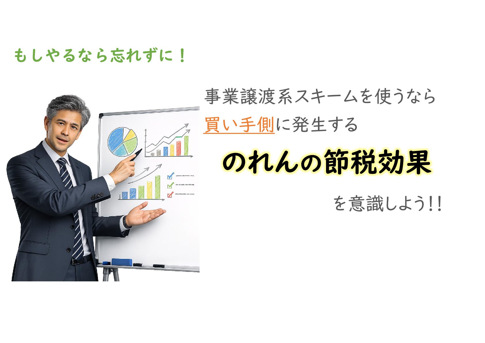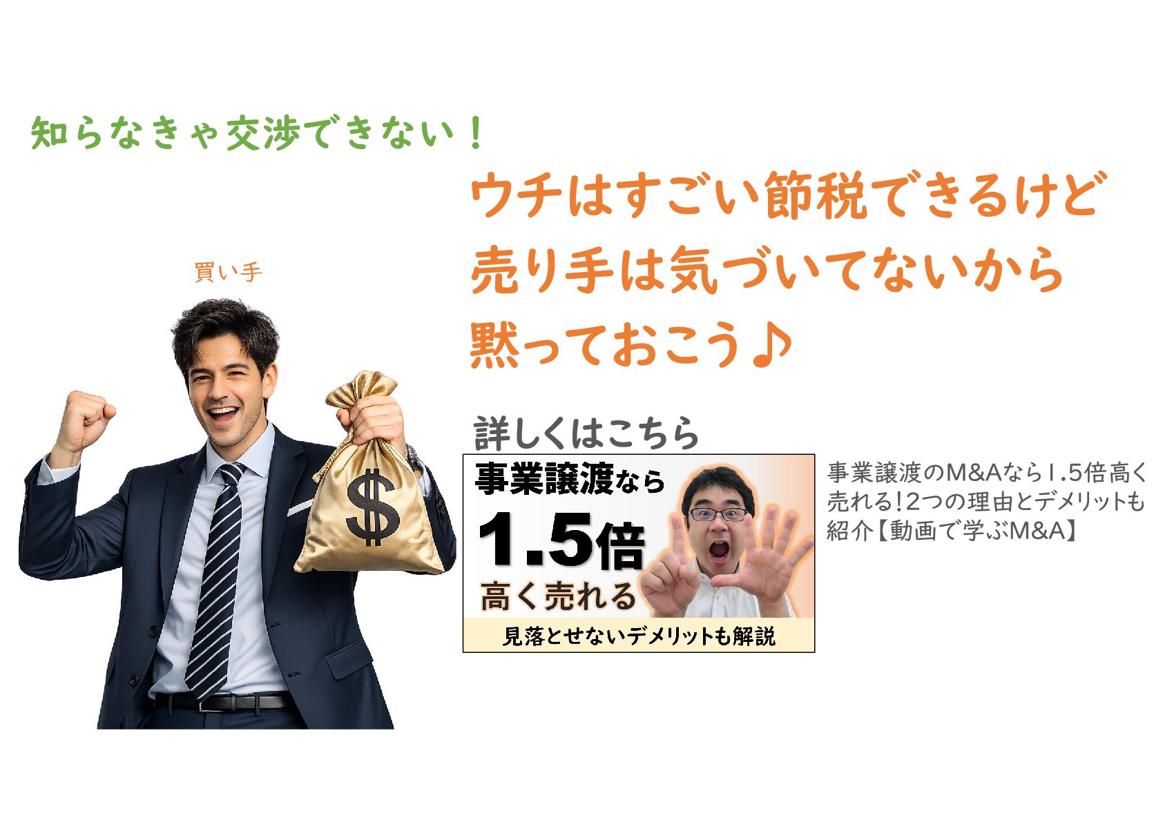 買い手のメリット: 買い手側で「のれん」の償却(5年)による大きな節税効果が生まれるため、これを価格交渉に活用できます。